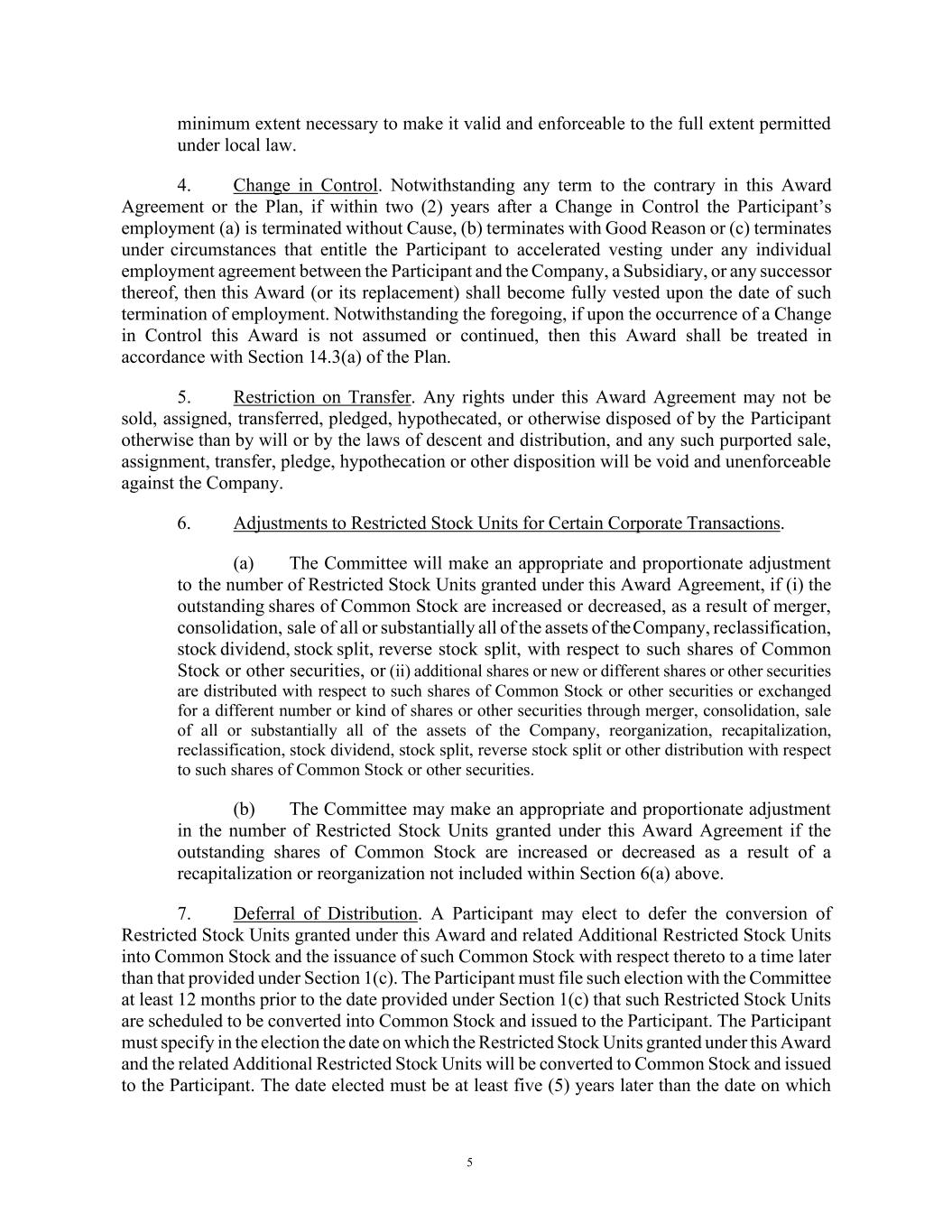 5 minimum extent necessary to make it valid and enforceable to the full extent permitted under local law. 4. Change in Control. Notwithstanding any term to the contrary in this Award Agreement or the Plan, if within two (2) years after a Change in Control the Participant’s employment (a) is terminated without Cause, (b) terminates with Good Reason or (c) terminates under circumstances that entitle the Participant to accelerated vesting under any individual employment agreement between the Participant and the Company, a Subsidiary, or any successor thereof, then this Award (or its replacement) shall become fully vested upon the date of such termination of employment. Notwithstanding the foregoing, if upon the occurrence of a Change in Control this Award is not assumed or continued, then this Award shall be treated in accordance with Section 14.3(a) of the Plan. 5. Restriction on Transfer. Any rights under this Award Agreement may not be sold, assigned, transferred, pledged, hypothecated, or otherwise disposed of by the Participant otherwise than by will or by the laws of descent and distribution, and any such purported sale, assignment, transfer, pledge, hypothecation or other disposition will be void and unenforceable against the Company. 6. Adjustments to Restricted Stock Units for Certain Corporate Transactions. (a) The Committee will make an appropriate and proportionate adjustment to the number of Restricted Stock Units granted under this Award Agreement, if (i) the outstanding shares of Common Stock are increased or decreased, as a result of merger, consolidation, sale of all or substantially all of the assets of the Company, reclassification, stock dividend, stock split, reverse stock split, with respect to such shares of Common Stock or other securities, or (ii) additional shares or new or different shares or other securities are distributed with respect to such shares of Common Stock or other securities or exchanged for a different number or kind of shares or other securities through merger, consolidation, sale of all or substantially all of the assets of the Company, reorganization, recapitalization, reclassification, stock dividend, stock split, reverse stock split or other distribution with respect to such shares of Common Stock or other securities. (b) The Committee may make an appropriate and proportionate adjustment in the number of Restricted Stock Units granted under this Award Agreement if the outstanding shares of Common Stock are increased or decreased as a result of a recapitalization or reorganization not included within Section 6(a) above. 7. Deferral of Distribution. A Participant may elect to defer the conversion of Restricted Stock Units granted under this Award and related Additional Restricted Stock Units into Common Stock and the issuance of such Common Stock with respect thereto to a time later than that provided under Section 1(c). The Participant must file such election with the Committee at least 12 months prior to the date provided under Section 1(c) that such Restricted Stock Units are scheduled to be converted into Common Stock and issued to the Participant. The Participant must specify in the election the date on which the Restricted Stock Units granted under this Award and the related Additional Restricted Stock Units will be converted to Common Stock and issued to the Participant. The date elected must be at least five (5) years later than the date on which