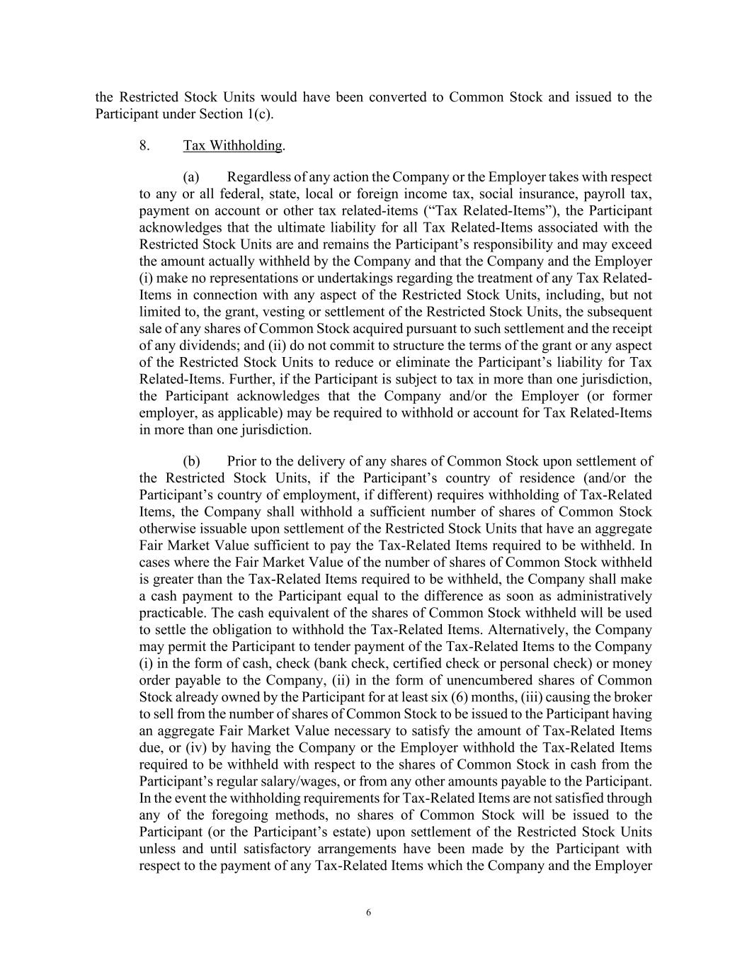 6 the Restricted Stock Units would have been converted to Common Stock and issued to the Participant under Section 1(c). 8. Tax Withholding. (a) Regardless of any action the Company or the Employer takes with respect to any or all federal, state, local or foreign income tax, social insurance, payroll tax, payment on account or other tax related-items (“Tax Related-Items”), the Participant acknowledges that the ultimate liability for all Tax Related-Items associated with the Restricted Stock Units are and remains the Participant’s responsibility and may exceed the amount actually withheld by the Company and that the Company and the Employer (i) make no representations or undertakings regarding the treatment of any Tax Related- Items in connection with any aspect of the Restricted Stock Units, including, but not limited to, the grant, vesting or settlement of the Restricted Stock Units, the subsequent sale of any shares of Common Stock acquired pursuant to such settlement and the receipt of any dividends; and (ii) do not commit to structure the terms of the grant or any aspect of the Restricted Stock Units to reduce or eliminate the Participant’s liability for Tax Related-Items. Further, if the Participant is subject to tax in more than one jurisdiction, the Participant acknowledges that the Company and/or the Employer (or former employer, as applicable) may be required to withhold or account for Tax Related-Items in more than one jurisdiction. (b) Prior to the delivery of any shares of Common Stock upon settlement of the Restricted Stock Units, if the Participant’s country of residence (and/or the Participant’s country of employment, if different) requires withholding of Tax-Related Items, the Company shall withhold a sufficient number of shares of Common Stock otherwise issuable upon settlement of the Restricted Stock Units that have an aggregate Fair Market Value sufficient to pay the Tax-Related Items required to be withheld. In cases where the Fair Market Value of the number of shares of Common Stock withheld is greater than the Tax-Related Items required to be withheld, the Company shall make a cash payment to the Participant equal to the difference as soon as administratively practicable. The cash equivalent of the shares of Common Stock withheld will be used to settle the obligation to withhold the Tax-Related Items. Alternatively, the Company may permit the Participant to tender payment of the Tax-Related Items to the Company (i) in the form of cash, check (bank check, certified check or personal check) or money order payable to the Company, (ii) in the form of unencumbered shares of Common Stock already owned by the Participant for at least six (6) months, (iii) causing the broker to sell from the number of shares of Common Stock to be issued to the Participant having an aggregate Fair Market Value necessary to satisfy the amount of Tax-Related Items due, or (iv) by having the Company or the Employer withhold the Tax-Related Items required to be withheld with respect to the shares of Common Stock in cash from the Participant’s regular salary/wages, or from any other amounts payable to the Participant. In the event the withholding requirements for Tax-Related Items are not satisfied through any of the foregoing methods, no shares of Common Stock will be issued to the Participant (or the Participant’s estate) upon settlement of the Restricted Stock Units unless and until satisfactory arrangements have been made by the Participant with respect to the payment of any Tax-Related Items which the Company and the Employer