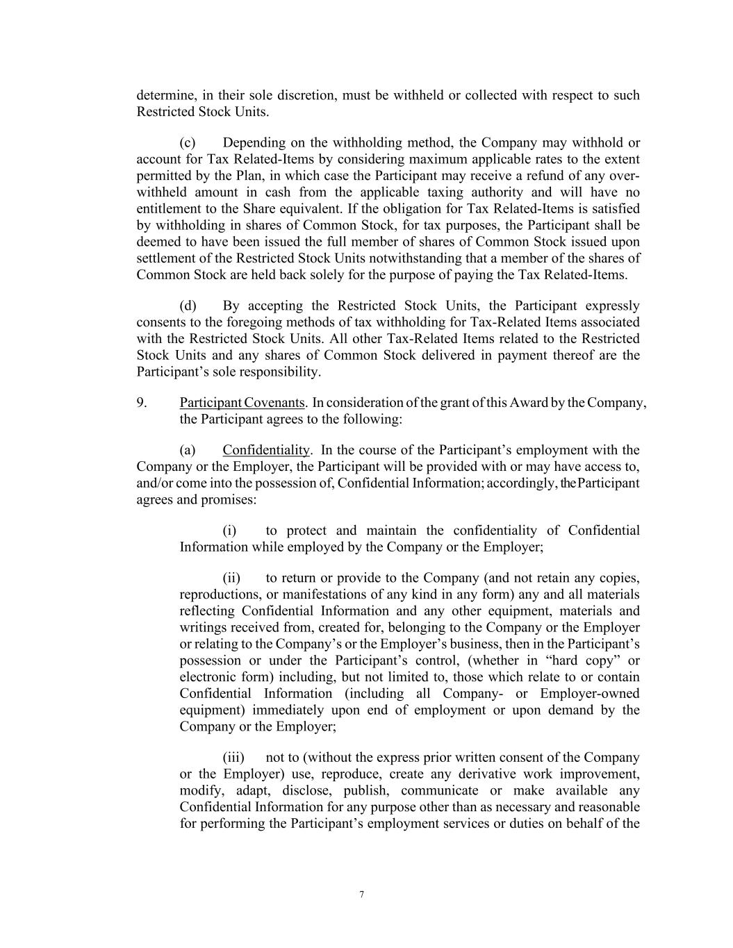 7 determine, in their sole discretion, must be withheld or collected with respect to such Restricted Stock Units. (c) Depending on the withholding method, the Company may withhold or account for Tax Related-Items by considering maximum applicable rates to the extent permitted by the Plan, in which case the Participant may receive a refund of any over- withheld amount in cash from the applicable taxing authority and will have no entitlement to the Share equivalent. If the obligation for Tax Related-Items is satisfied by withholding in shares of Common Stock, for tax purposes, the Participant shall be deemed to have been issued the full member of shares of Common Stock issued upon settlement of the Restricted Stock Units notwithstanding that a member of the shares of Common Stock are held back solely for the purpose of paying the Tax Related-Items. (d) By accepting the Restricted Stock Units, the Participant expressly consents to the foregoing methods of tax withholding for Tax-Related Items associated with the Restricted Stock Units. All other Tax-Related Items related to the Restricted Stock Units and any shares of Common Stock delivered in payment thereof are the Participant’s sole responsibility. 9. Participant Covenants. In consideration of the grant of this Award by the Company, the Participant agrees to the following: (a) Confidentiality. In the course of the Participant’s employment with the Company or the Employer, the Participant will be provided with or may have access to, and/or come into the possession of, Confidential Information; accordingly, the Participant agrees and promises: (i) to protect and maintain the confidentiality of Confidential Information while employed by the Company or the Employer; (ii) to return or provide to the Company (and not retain any copies, reproductions, or manifestations of any kind in any form) any and all materials reflecting Confidential Information and any other equipment, materials and writings received from, created for, belonging to the Company or the Employer or relating to the Company’s or the Employer’s business, then in the Participant’s possession or under the Participant’s control, (whether in “hard copy” or electronic form) including, but not limited to, those which relate to or contain Confidential Information (including all Company- or Employer-owned equipment) immediately upon end of employment or upon demand by the Company or the Employer; (iii) not to (without the express prior written consent of the Company or the Employer) use, reproduce, create any derivative work improvement, modify, adapt, disclose, publish, communicate or make available any Confidential Information for any purpose other than as necessary and reasonable for performing the Participant’s employment services or duties on behalf of the