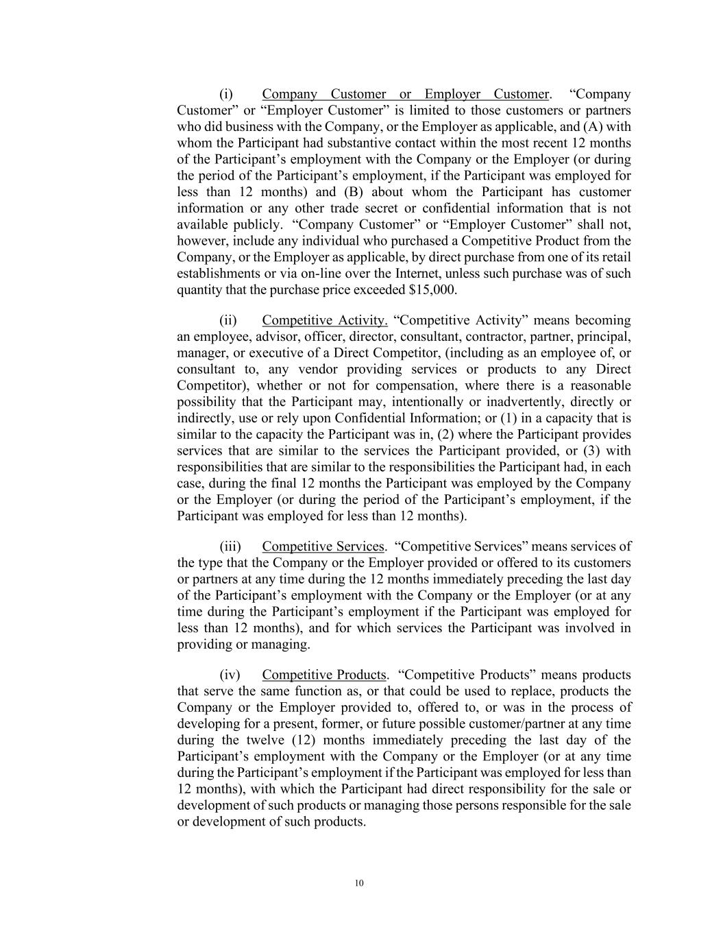 10 (i) Company Customer or Employer Customer. “Company Customer” or “Employer Customer” is limited to those customers or partners who did business with the Company, or the Employer as applicable, and (A) with whom the Participant had substantive contact within the most recent 12 months of the Participant’s employment with the Company or the Employer (or during the period of the Participant’s employment, if the Participant was employed for less than 12 months) and (B) about whom the Participant has customer information or any other trade secret or confidential information that is not available publicly. “Company Customer” or “Employer Customer” shall not, however, include any individual who purchased a Competitive Product from the Company, or the Employer as applicable, by direct purchase from one of its retail establishments or via on-line over the Internet, unless such purchase was of such quantity that the purchase price exceeded $15,000. (ii) Competitive Activity. “Competitive Activity” means becoming an employee, advisor, officer, director, consultant, contractor, partner, principal, manager, or executive of a Direct Competitor, (including as an employee of, or consultant to, any vendor providing services or products to any Direct Competitor), whether or not for compensation, where there is a reasonable possibility that the Participant may, intentionally or inadvertently, directly or indirectly, use or rely upon Confidential Information; or (1) in a capacity that is similar to the capacity the Participant was in, (2) where the Participant provides services that are similar to the services the Participant provided, or (3) with responsibilities that are similar to the responsibilities the Participant had, in each case, during the final 12 months the Participant was employed by the Company or the Employer (or during the period of the Participant’s employment, if the Participant was employed for less than 12 months). (iii) Competitive Services. “Competitive Services” means services of the type that the Company or the Employer provided or offered to its customers or partners at any time during the 12 months immediately preceding the last day of the Participant’s employment with the Company or the Employer (or at any time during the Participant’s employment if the Participant was employed for less than 12 months), and for which services the Participant was involved in providing or managing. (iv) Competitive Products. “Competitive Products” means products that serve the same function as, or that could be used to replace, products the Company or the Employer provided to, offered to, or was in the process of developing for a present, former, or future possible customer/partner at any time during the twelve (12) months immediately preceding the last day of the Participant’s employment with the Company or the Employer (or at any time during the Participant’s employment if the Participant was employed for less than 12 months), with which the Participant had direct responsibility for the sale or development of such products or managing those persons responsible for the sale or development of such products.