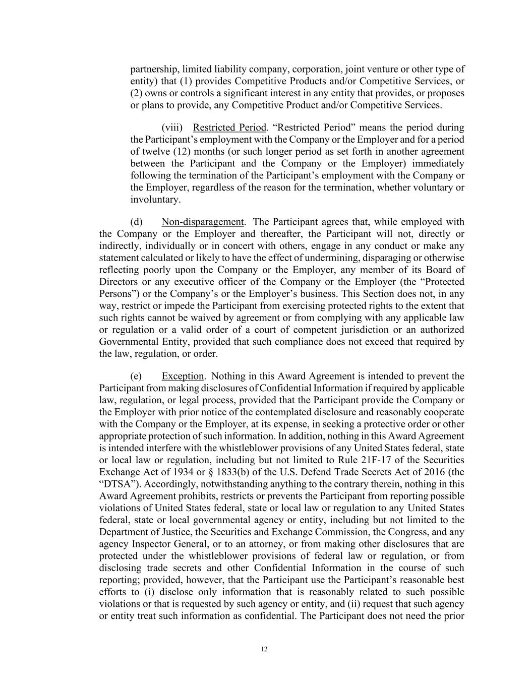 12 partnership, limited liability company, corporation, joint venture or other type of entity) that (1) provides Competitive Products and/or Competitive Services, or (2) owns or controls a significant interest in any entity that provides, or proposes or plans to provide, any Competitive Product and/or Competitive Services. (viii) Restricted Period. “Restricted Period” means the period during the Participant’s employment with the Company or the Employer and for a period of twelve (12) months (or such longer period as set forth in another agreement between the Participant and the Company or the Employer) immediately following the termination of the Participant’s employment with the Company or the Employer, regardless of the reason for the termination, whether voluntary or involuntary. (d) Non-disparagement. The Participant agrees that, while employed with the Company or the Employer and thereafter, the Participant will not, directly or indirectly, individually or in concert with others, engage in any conduct or make any statement calculated or likely to have the effect of undermining, disparaging or otherwise reflecting poorly upon the Company or the Employer, any member of its Board of Directors or any executive officer of the Company or the Employer (the “Protected Persons”) or the Company’s or the Employer’s business. This Section does not, in any way, restrict or impede the Participant from exercising protected rights to the extent that such rights cannot be waived by agreement or from complying with any applicable law or regulation or a valid order of a court of competent jurisdiction or an authorized Governmental Entity, provided that such compliance does not exceed that required by the law, regulation, or order. (e) Exception. Nothing in this Award Agreement is intended to prevent the Participant from making disclosures of Confidential Information if required by applicable law, regulation, or legal process, provided that the Participant provide the Company or the Employer with prior notice of the contemplated disclosure and reasonably cooperate with the Company or the Employer, at its expense, in seeking a protective order or other appropriate protection of such information. In addition, nothing in this Award Agreement is intended interfere with the whistleblower provisions of any United States federal, state or local law or regulation, including but not limited to Rule 21F-17 of the Securities Exchange Act of 1934 or § 1833(b) of the U.S. Defend Trade Secrets Act of 2016 (the “DTSA”). Accordingly, notwithstanding anything to the contrary therein, nothing in this Award Agreement prohibits, restricts or prevents the Participant from reporting possible violations of United States federal, state or local law or regulation to any United States federal, state or local governmental agency or entity, including but not limited to the Department of Justice, the Securities and Exchange Commission, the Congress, and any agency Inspector General, or to an attorney, or from making other disclosures that are protected under the whistleblower provisions of federal law or regulation, or from disclosing trade secrets and other Confidential Information in the course of such reporting; provided, however, that the Participant use the Participant’s reasonable best efforts to (i) disclose only information that is reasonably related to such possible violations or that is requested by such agency or entity, and (ii) request that such agency or entity treat such information as confidential. The Participant does not need the prior