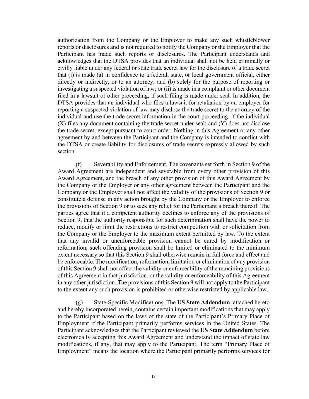 13 authorization from the Company or the Employer to make any such whistleblower reports or disclosures and is not required to notify the Company or the Employer that the Participant has made such reports or disclosures. The Participant understands and acknowledges that the DTSA provides that an individual shall not be held criminally or civilly liable under any federal or state trade secret law for the disclosure of a trade secret that (i) is made (a) in confidence to a federal, state, or local government official, either directly or indirectly, or to an attorney; and (b) solely for the purpose of reporting or investigating a suspected violation of law; or (ii) is made in a complaint or other document filed in a lawsuit or other proceeding, if such filing is made under seal. In addition, the DTSA provides that an individual who files a lawsuit for retaliation by an employer for reporting a suspected violation of law may disclose the trade secret to the attorney of the individual and use the trade secret information in the court proceeding, if the individual (X) files any document containing the trade secret under seal; and (Y) does not disclose the trade secret, except pursuant to court order. Nothing in this Agreement or any other agreement by and between the Participant and the Company is intended to conflict with the DTSA or create liability for disclosures of trade secrets expressly allowed by such section. (f) Severability and Enforcement. The covenants set forth in Section 9 of the Award Agreement are independent and severable from every other provision of this Award Agreement, and the breach of any other provision of this Award Agreement by the Company or the Employer or any other agreement between the Participant and the Company or the Employer shall not affect the validity of the provisions of Section 9 or constitute a defense in any action brought by the Company or the Employer to enforce the provisions of Section 9 or to seek any relief for the Participant’s breach thereof. The parties agree that if a competent authority declines to enforce any of the provisions of Section 9, that the authority responsible for such determination shall have the power to reduce, modify or limit the restrictions to restrict competition with or solicitation from the Company or the Employer to the maximum extent permitted by law. To the extent that any invalid or unenforceable provision cannot be cured by modification or reformation, such offending provision shall be limited or eliminated to the minimum extent necessary so that this Section 9 shall otherwise remain in full force and effect and be enforceable. The modification, reformation, limitation or elimination of any provision of this Section 9 shall not affect the validity or enforceability of the remaining provisions of this Agreement in that jurisdiction, or the validity or enforceability of this Agreement in any other jurisdiction. The provisions of this Section 9 will not apply to the Participant to the extent any such provision is prohibited or otherwise restricted by applicable law. (g) State-Specific Modifications. The US State Addendum, attached hereto and hereby incorporated herein, contains certain important modifications that may apply to the Participant based on the laws of the state of the Participant’s Primary Place of Employment if the Participant primarily performs services in the United States. The Participant acknowledges that the Participant reviewed the US State Addendum before electronically accepting this Award Agreement and understand the impact of state law modifications, if any, that may apply to the Participant. The term “Primary Place of Employment” means the location where the Participant primarily performs services for