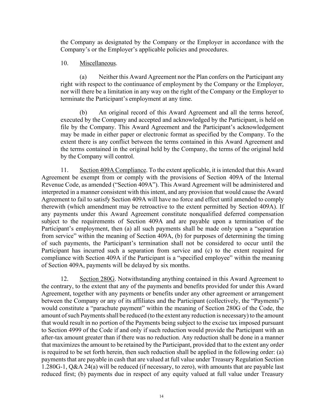 14 the Company as designated by the Company or the Employer in accordance with the Company’s or the Employer’s applicable policies and procedures. 10. Miscellaneous. (a) Neither this Award Agreement nor the Plan confers on the Participant any right with respect to the continuance of employment by the Company or the Employer, nor will there be a limitation in any way on the right of the Company or the Employer to terminate the Participant’s employment at any time. (b) An original record of this Award Agreement and all the terms hereof, executed by the Company and accepted and acknowledged by the Participant, is held on file by the Company. This Award Agreement and the Participant’s acknowledgement may be made in either paper or electronic format as specified by the Company. To the extent there is any conflict between the terms contained in this Award Agreement and the terms contained in the original held by the Company, the terms of the original held by the Company will control. 11. Section 409A Compliance. To the extent applicable, it is intended that this Award Agreement be exempt from or comply with the provisions of Section 409A of the Internal Revenue Code, as amended (“Section 409A”). This Award Agreement will be administered and interpreted in a manner consistent with this intent, and any provision that would cause the Award Agreement to fail to satisfy Section 409A will have no force and effect until amended to comply therewith (which amendment may be retroactive to the extent permitted by Section 409A). If any payments under this Award Agreement constitute nonqualified deferred compensation subject to the requirements of Section 409A and are payable upon a termination of the Participant’s employment, then (a) all such payments shall be made only upon a “separation from service” within the meaning of Section 409A, (b) for purposes of determining the timing of such payments, the Participant’s termination shall not be considered to occur until the Participant has incurred such a separation from service and (c) to the extent required for compliance with Section 409A if the Participant is a “specified employee” within the meaning of Section 409A, payments will be delayed by six months. 12. Section 280G. Notwithstanding anything contained in this Award Agreement to the contrary, to the extent that any of the payments and benefits provided for under this Award Agreement, together with any payments or benefits under any other agreement or arrangement between the Company or any of its affiliates and the Participant (collectively, the “Payments”) would constitute a “parachute payment” within the meaning of Section 280G of the Code, the amount of such Payments shall be reduced (to the extent any reduction is necessary) to the amount that would result in no portion of the Payments being subject to the excise tax imposed pursuant to Section 4999 of the Code if and only if such reduction would provide the Participant with an after-tax amount greater than if there was no reduction. Any reduction shall be done in a manner that maximizes the amount to be retained by the Participant, provided that to the extent any order is required to be set forth herein, then such reduction shall be applied in the following order: (a) payments that are payable in cash that are valued at full value under Treasury Regulation Section 1.280G-1, Q&A 24(a) will be reduced (if necessary, to zero), with amounts that are payable last reduced first; (b) payments due in respect of any equity valued at full value under Treasury
