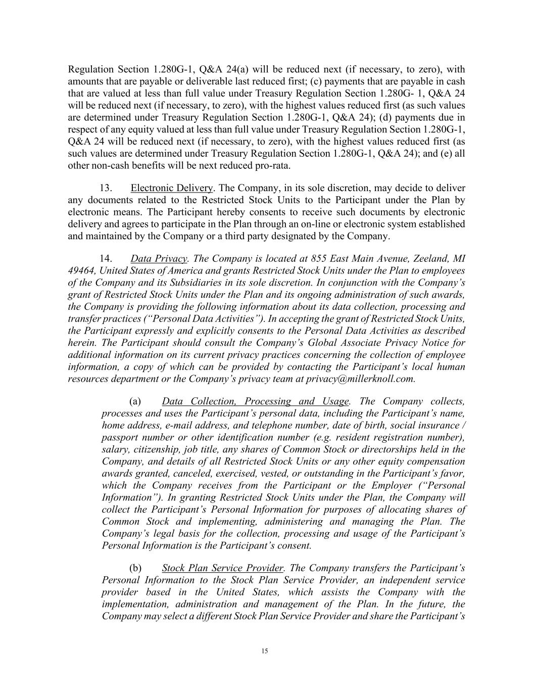 15 Regulation Section 1.280G-1, Q&A 24(a) will be reduced next (if necessary, to zero), with amounts that are payable or deliverable last reduced first; (c) payments that are payable in cash that are valued at less than full value under Treasury Regulation Section 1.280G- 1, Q&A 24 will be reduced next (if necessary, to zero), with the highest values reduced first (as such values are determined under Treasury Regulation Section 1.280G-1, Q&A 24); (d) payments due in respect of any equity valued at less than full value under Treasury Regulation Section 1.280G-1, Q&A 24 will be reduced next (if necessary, to zero), with the highest values reduced first (as such values are determined under Treasury Regulation Section 1.280G-1, Q&A 24); and (e) all other non-cash benefits will be next reduced pro-rata. 13. Electronic Delivery. The Company, in its sole discretion, may decide to deliver any documents related to the Restricted Stock Units to the Participant under the Plan by electronic means. The Participant hereby consents to receive such documents by electronic delivery and agrees to participate in the Plan through an on-line or electronic system established and maintained by the Company or a third party designated by the Company. 14. Data Privacy. The Company is located at 855 East Main Avenue, Zeeland, MI 49464, United States of America and grants Restricted Stock Units under the Plan to employees of the Company and its Subsidiaries in its sole discretion. In conjunction with the Company’s grant of Restricted Stock Units under the Plan and its ongoing administration of such awards, the Company is providing the following information about its data collection, processing and transfer practices (“Personal Data Activities”). In accepting the grant of Restricted Stock Units, the Participant expressly and explicitly consents to the Personal Data Activities as described herein. The Participant should consult the Company’s Global Associate Privacy Notice for additional information on its current privacy practices concerning the collection of employee information, a copy of which can be provided by contacting the Participant’s local human resources department or the Company’s privacy team at privacy@millerknoll.com. (a) Data Collection, Processing and Usage. The Company collects, processes and uses the Participant’s personal data, including the Participant’s name, home address, e-mail address, and telephone number, date of birth, social insurance / passport number or other identification number (e.g. resident registration number), salary, citizenship, job title, any shares of Common Stock or directorships held in the Company, and details of all Restricted Stock Units or any other equity compensation awards granted, canceled, exercised, vested, or outstanding in the Participant’s favor, which the Company receives from the Participant or the Employer (“Personal Information”). In granting Restricted Stock Units under the Plan, the Company will collect the Participant’s Personal Information for purposes of allocating shares of Common Stock and implementing, administering and managing the Plan. The Company’s legal basis for the collection, processing and usage of the Participant’s Personal Information is the Participant’s consent. (b) Stock Plan Service Provider. The Company transfers the Participant’s Personal Information to the Stock Plan Service Provider, an independent service provider based in the United States, which assists the Company with the implementation, administration and management of the Plan. In the future, the Company may select a different Stock Plan Service Provider and share the Participant’s
