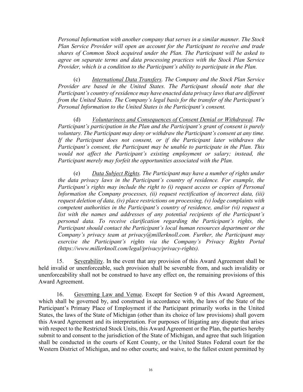 16 Personal Information with another company that serves in a similar manner. The Stock Plan Service Provider will open an account for the Participant to receive and trade shares of Common Stock acquired under the Plan. The Participant will be asked to agree on separate terms and data processing practices with the Stock Plan Service Provider, which is a condition to the Participant’s ability to participate in the Plan. (c) International Data Transfers. The Company and the Stock Plan Service Provider are based in the United States. The Participant should note that the Participant’s country of residence may have enacted data privacy laws that are different from the United States. The Company’s legal basis for the transfer of the Participant’s Personal Information to the United States is the Participant’s consent. (d) Voluntariness and Consequences of Consent Denial or Withdrawal. The Participant’s participation in the Plan and the Participant’s grant of consent is purely voluntary. The Participant may deny or withdraw the Participant’s consent at any time. If the Participant does not consent, or if the Participant later withdraws the Participant’s consent, the Participant may be unable to participate in the Plan. This would not affect the Participant’s existing employment or salary; instead, the Participant merely may forfeit the opportunities associated with the Plan. (e) Data Subject Rights. The Participant may have a number of rights under the data privacy laws in the Participant’s country of residence. For example, the Participant’s rights may include the right to (i) request access or copies of Personal Information the Company processes, (ii) request rectification of incorrect data, (iii) request deletion of data, (iv) place restrictions on processing, (v) lodge complaints with competent authorities in the Participant’s country of residence, and/or (vi) request a list with the names and addresses of any potential recipients of the Participant’s personal data. To receive clarification regarding the Participant’s rights, the Participant should contact the Participant’s local human resources department or the Company’s privacy team at privacy@millerknoll.com. Further, the Participant may exercise the Participant’s rights via the Company’s Privacy Rights Portal (https://www.millerknoll.com/legal/privacy/privacy-rights). 15. Severability. In the event that any provision of this Award Agreement shall be held invalid or unenforceable, such provision shall be severable from, and such invalidity or unenforceability shall not be construed to have any effect on, the remaining provisions of this Award Agreement. 16. Governing Law and Venue. Except for Section 9 of this Award Agreement, which shall be governed by, and construed in accordance with, the laws of the State of the Participant’s Primary Place of Employment if the Participant primarily works in the United States, the laws of the State of Michigan (other than its choice of law provisions) shall govern this Award Agreement and its interpretation. For purposes of litigating any dispute that arises with respect to the Restricted Stock Units, this Award Agreement or the Plan, the parties hereby submit to and consent to the jurisdiction of the State of Michigan, and agree that such litigation shall be conducted in the courts of Kent County, or the United States Federal court for the Western District of Michigan, and no other courts; and waive, to the fullest extent permitted by