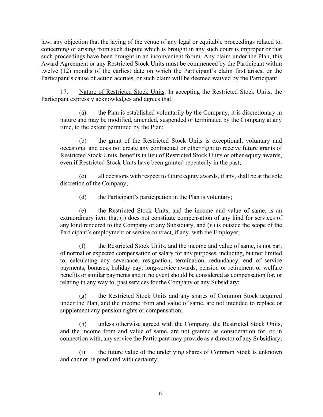 17 law, any objection that the laying of the venue of any legal or equitable proceedings related to, concerning or arising from such dispute which is brought in any such court is improper or that such proceedings have been brought in an inconvenient forum. Any claim under the Plan, this Award Agreement or any Restricted Stock Units must be commenced by the Participant within twelve (12) months of the earliest date on which the Participant’s claim first arises, or the Participant’s cause of action accrues, or such claim will be deemed waived by the Participant. 17. Nature of Restricted Stock Units. In accepting the Restricted Stock Units, the Participant expressly acknowledges and agrees that: (a) the Plan is established voluntarily by the Company, it is discretionary in nature and may be modified, amended, suspended or terminated by the Company at any time, to the extent permitted by the Plan; (b) the grant of the Restricted Stock Units is exceptional, voluntary and occasional and does not create any contractual or other right to receive future grants of Restricted Stock Units, benefits in lieu of Restricted Stock Units or other equity awards, even if Restricted Stock Units have been granted repeatedly in the past; (c) all decisions with respect to future equity awards, if any, shall be at the sole discretion of the Company; (d) the Participant’s participation in the Plan is voluntary; (e) the Restricted Stock Units, and the income and value of same, is an extraordinary item that (i) does not constitute compensation of any kind for services of any kind rendered to the Company or any Subsidiary, and (ii) is outside the scope of the Participant’s employment or service contract, if any, with the Employer; (f) the Restricted Stock Units, and the income and value of same, is not part of normal or expected compensation or salary for any purposes, including, but not limited to, calculating any severance, resignation, termination, redundancy, end of service payments, bonuses, holiday pay, long-service awards, pension or retirement or welfare benefits or similar payments and in no event should be considered as compensation for, or relating in any way to, past services for the Company or any Subsidiary; (g) the Restricted Stock Units and any shares of Common Stock acquired under the Plan, and the income from and value of same, are not intended to replace or supplement any pension rights or compensation; (h) unless otherwise agreed with the Company, the Restricted Stock Units, and the income from and value of same, are not granted as consideration for, or in connection with, any service the Participant may provide as a director of any Subsidiary; (i) the future value of the underlying shares of Common Stock is unknown and cannot be predicted with certainty;