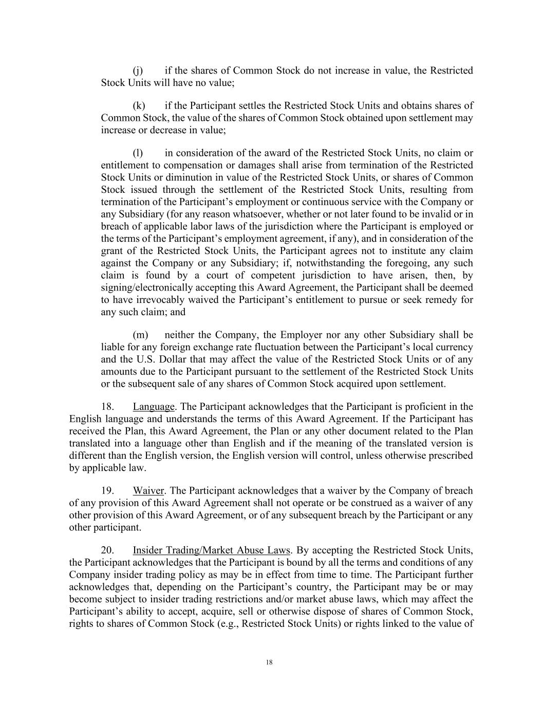 18 (j) if the shares of Common Stock do not increase in value, the Restricted Stock Units will have no value; (k) if the Participant settles the Restricted Stock Units and obtains shares of Common Stock, the value of the shares of Common Stock obtained upon settlement may increase or decrease in value; (l) in consideration of the award of the Restricted Stock Units, no claim or entitlement to compensation or damages shall arise from termination of the Restricted Stock Units or diminution in value of the Restricted Stock Units, or shares of Common Stock issued through the settlement of the Restricted Stock Units, resulting from termination of the Participant’s employment or continuous service with the Company or any Subsidiary (for any reason whatsoever, whether or not later found to be invalid or in breach of applicable labor laws of the jurisdiction where the Participant is employed or the terms of the Participant’s employment agreement, if any), and in consideration of the grant of the Restricted Stock Units, the Participant agrees not to institute any claim against the Company or any Subsidiary; if, notwithstanding the foregoing, any such claim is found by a court of competent jurisdiction to have arisen, then, by signing/electronically accepting this Award Agreement, the Participant shall be deemed to have irrevocably waived the Participant’s entitlement to pursue or seek remedy for any such claim; and (m) neither the Company, the Employer nor any other Subsidiary shall be liable for any foreign exchange rate fluctuation between the Participant’s local currency and the U.S. Dollar that may affect the value of the Restricted Stock Units or of any amounts due to the Participant pursuant to the settlement of the Restricted Stock Units or the subsequent sale of any shares of Common Stock acquired upon settlement. 18. Language. The Participant acknowledges that the Participant is proficient in the English language and understands the terms of this Award Agreement. If the Participant has received the Plan, this Award Agreement, the Plan or any other document related to the Plan translated into a language other than English and if the meaning of the translated version is different than the English version, the English version will control, unless otherwise prescribed by applicable law. 19. Waiver. The Participant acknowledges that a waiver by the Company of breach of any provision of this Award Agreement shall not operate or be construed as a waiver of any other provision of this Award Agreement, or of any subsequent breach by the Participant or any other participant. 20. Insider Trading/Market Abuse Laws. By accepting the Restricted Stock Units, the Participant acknowledges that the Participant is bound by all the terms and conditions of any Company insider trading policy as may be in effect from time to time. The Participant further acknowledges that, depending on the Participant’s country, the Participant may be or may become subject to insider trading restrictions and/or market abuse laws, which may affect the Participant’s ability to accept, acquire, sell or otherwise dispose of shares of Common Stock, rights to shares of Common Stock (e.g., Restricted Stock Units) or rights linked to the value of