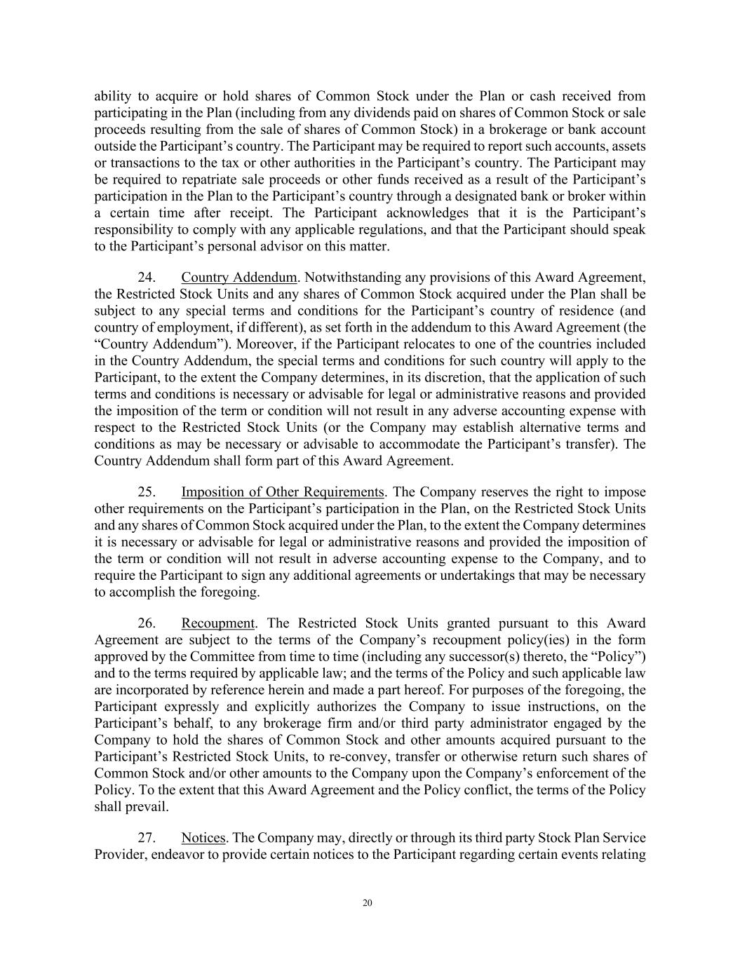 20 ability to acquire or hold shares of Common Stock under the Plan or cash received from participating in the Plan (including from any dividends paid on shares of Common Stock or sale proceeds resulting from the sale of shares of Common Stock) in a brokerage or bank account outside the Participant’s country. The Participant may be required to report such accounts, assets or transactions to the tax or other authorities in the Participant’s country. The Participant may be required to repatriate sale proceeds or other funds received as a result of the Participant’s participation in the Plan to the Participant’s country through a designated bank or broker within a certain time after receipt. The Participant acknowledges that it is the Participant’s responsibility to comply with any applicable regulations, and that the Participant should speak to the Participant’s personal advisor on this matter. 24. Country Addendum. Notwithstanding any provisions of this Award Agreement, the Restricted Stock Units and any shares of Common Stock acquired under the Plan shall be subject to any special terms and conditions for the Participant’s country of residence (and country of employment, if different), as set forth in the addendum to this Award Agreement (the “Country Addendum”). Moreover, if the Participant relocates to one of the countries included in the Country Addendum, the special terms and conditions for such country will apply to the Participant, to the extent the Company determines, in its discretion, that the application of such terms and conditions is necessary or advisable for legal or administrative reasons and provided the imposition of the term or condition will not result in any adverse accounting expense with respect to the Restricted Stock Units (or the Company may establish alternative terms and conditions as may be necessary or advisable to accommodate the Participant’s transfer). The Country Addendum shall form part of this Award Agreement. 25. Imposition of Other Requirements. The Company reserves the right to impose other requirements on the Participant’s participation in the Plan, on the Restricted Stock Units and any shares of Common Stock acquired under the Plan, to the extent the Company determines it is necessary or advisable for legal or administrative reasons and provided the imposition of the term or condition will not result in adverse accounting expense to the Company, and to require the Participant to sign any additional agreements or undertakings that may be necessary to accomplish the foregoing. 26. Recoupment. The Restricted Stock Units granted pursuant to this Award Agreement are subject to the terms of the Company’s recoupment policy(ies) in the form approved by the Committee from time to time (including any successor(s) thereto, the “Policy”) and to the terms required by applicable law; and the terms of the Policy and such applicable law are incorporated by reference herein and made a part hereof. For purposes of the foregoing, the Participant expressly and explicitly authorizes the Company to issue instructions, on the Participant’s behalf, to any brokerage firm and/or third party administrator engaged by the Company to hold the shares of Common Stock and other amounts acquired pursuant to the Participant’s Restricted Stock Units, to re-convey, transfer or otherwise return such shares of Common Stock and/or other amounts to the Company upon the Company’s enforcement of the Policy. To the extent that this Award Agreement and the Policy conflict, the terms of the Policy shall prevail. 27. Notices. The Company may, directly or through its third party Stock Plan Service Provider, endeavor to provide certain notices to the Participant regarding certain events relating