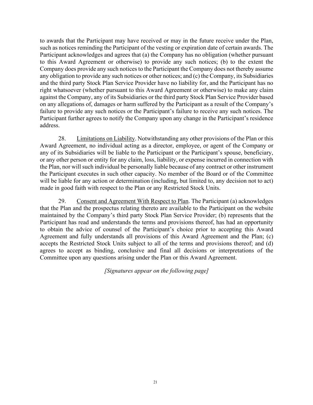 21 to awards that the Participant may have received or may in the future receive under the Plan, such as notices reminding the Participant of the vesting or expiration date of certain awards. The Participant acknowledges and agrees that (a) the Company has no obligation (whether pursuant to this Award Agreement or otherwise) to provide any such notices; (b) to the extent the Company does provide any such notices to the Participant the Company does not thereby assume any obligation to provide any such notices or other notices; and (c) the Company, its Subsidiaries and the third party Stock Plan Service Provider have no liability for, and the Participant has no right whatsoever (whether pursuant to this Award Agreement or otherwise) to make any claim against the Company, any of its Subsidiaries or the third party Stock Plan Service Provider based on any allegations of, damages or harm suffered by the Participant as a result of the Company’s failure to provide any such notices or the Participant’s failure to receive any such notices. The Participant further agrees to notify the Company upon any change in the Participant’s residence address. 28. Limitations on Liability. Notwithstanding any other provisions of the Plan or this Award Agreement, no individual acting as a director, employee, or agent of the Company or any of its Subsidiaries will be liable to the Participant or the Participant’s spouse, beneficiary, or any other person or entity for any claim, loss, liability, or expense incurred in connection with the Plan, nor will such individual be personally liable because of any contract or other instrument the Participant executes in such other capacity. No member of the Board or of the Committee will be liable for any action or determination (including, but limited to, any decision not to act) made in good faith with respect to the Plan or any Restricted Stock Units. 29. Consent and Agreement With Respect to Plan. The Participant (a) acknowledges that the Plan and the prospectus relating thereto are available to the Participant on the website maintained by the Company’s third party Stock Plan Service Provider; (b) represents that the Participant has read and understands the terms and provisions thereof, has had an opportunity to obtain the advice of counsel of the Participant’s choice prior to accepting this Award Agreement and fully understands all provisions of this Award Agreement and the Plan; (c) accepts the Restricted Stock Units subject to all of the terms and provisions thereof; and (d) agrees to accept as binding, conclusive and final all decisions or interpretations of the Committee upon any questions arising under the Plan or this Award Agreement. [Signatures appear on the following page]