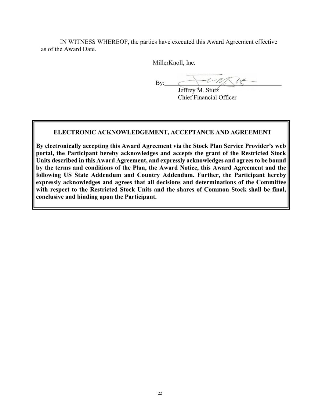 22 IN WITNESS WHEREOF, the parties have executed this Award Agreement effective as of the Award Date. MillerKnoll, Inc. By: Jeffrey M. Stutz Chief Financial Officer ELECTRONIC ACKNOWLEDGEMENT, ACCEPTANCE AND AGREEMENT By electronically accepting this Award Agreement via the Stock Plan Service Provider’s web portal, the Participant hereby acknowledges and accepts the grant of the Restricted Stock Units described in this Award Agreement, and expressly acknowledges and agrees to be bound by the terms and conditions of the Plan, the Award Notice, this Award Agreement and the following US State Addendum and Country Addendum. Further, the Participant hereby expressly acknowledges and agrees that all decisions and determinations of the Committee with respect to the Restricted Stock Units and the shares of Common Stock shall be final, conclusive and binding upon the Participant.