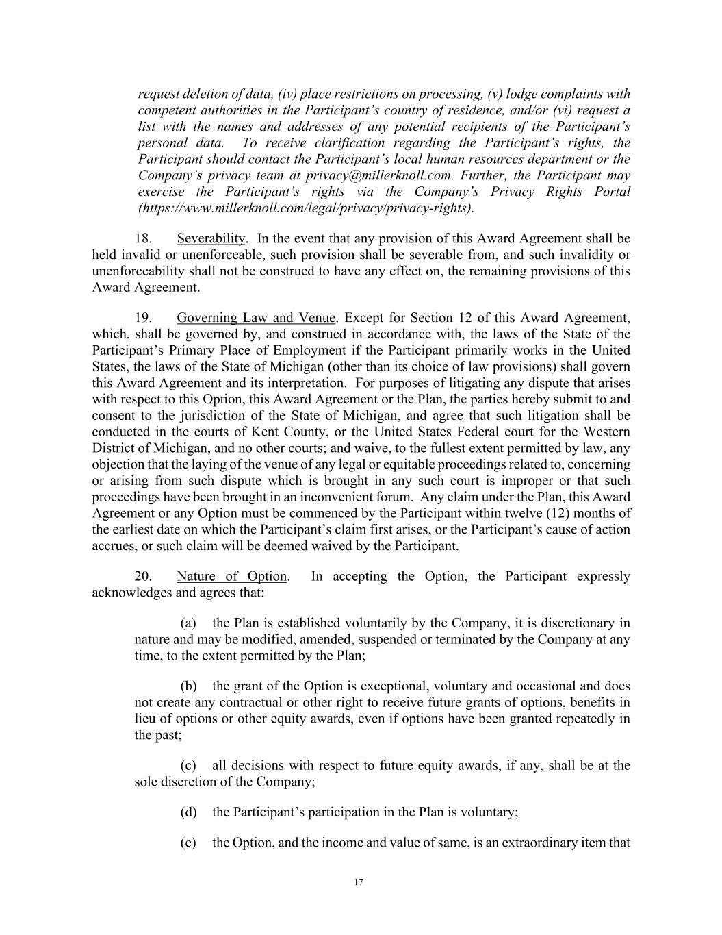 17 request deletion of data, (iv) place restrictions on processing, (v) lodge complaints with competent authorities in the Participant’s country of residence, and/or (vi) request a list with the names and addresses of any potential recipients of the Participant’s personal data. To receive clarification regarding the Participant’s rights, the Participant should contact the Participant’s local human resources department or the Company’s privacy team at privacy@millerknoll.com. Further, the Participant may exercise the Participant’s rights via the Company’s Privacy Rights Portal (https://www.millerknoll.com/legal/privacy/privacy-rights). 18. Severability. In the event that any provision of this Award Agreement shall be held invalid or unenforceable, such provision shall be severable from, and such invalidity or unenforceability shall not be construed to have any effect on, the remaining provisions of this Award Agreement. 19. Governing Law and Venue. Except for Section 12 of this Award Agreement, which, shall be governed by, and construed in accordance with, the laws of the State of the Participant’s Primary Place of Employment if the Participant primarily works in the United States, the laws of the State of Michigan (other than its choice of law provisions) shall govern this Award Agreement and its interpretation. For purposes of litigating any dispute that arises with respect to this Option, this Award Agreement or the Plan, the parties hereby submit to and consent to the jurisdiction of the State of Michigan, and agree that such litigation shall be conducted in the courts of Kent County, or the United States Federal court for the Western District of Michigan, and no other courts; and waive, to the fullest extent permitted by law, any objection that the laying of the venue of any legal or equitable proceedings related to, concerning or arising from such dispute which is brought in any such court is improper or that such proceedings have been brought in an inconvenient forum. Any claim under the Plan, this Award Agreement or any Option must be commenced by the Participant within twelve (12) months of the earliest date on which the Participant’s claim first arises, or the Participant’s cause of action accrues, or such claim will be deemed waived by the Participant. 20. Nature of Option. In accepting the Option, the Participant expressly acknowledges and agrees that: (a) the Plan is established voluntarily by the Company, it is discretionary in nature and may be modified, amended, suspended or terminated by the Company at any time, to the extent permitted by the Plan; (b) the grant of the Option is exceptional, voluntary and occasional and does not create any contractual or other right to receive future grants of options, benefits in lieu of options or other equity awards, even if options have been granted repeatedly in the past; (c) all decisions with respect to future equity awards, if any, shall be at the sole discretion of the Company; (d) the Participant’s participation in the Plan is voluntary; (e) the Option, and the income and value of same, is an extraordinary item that