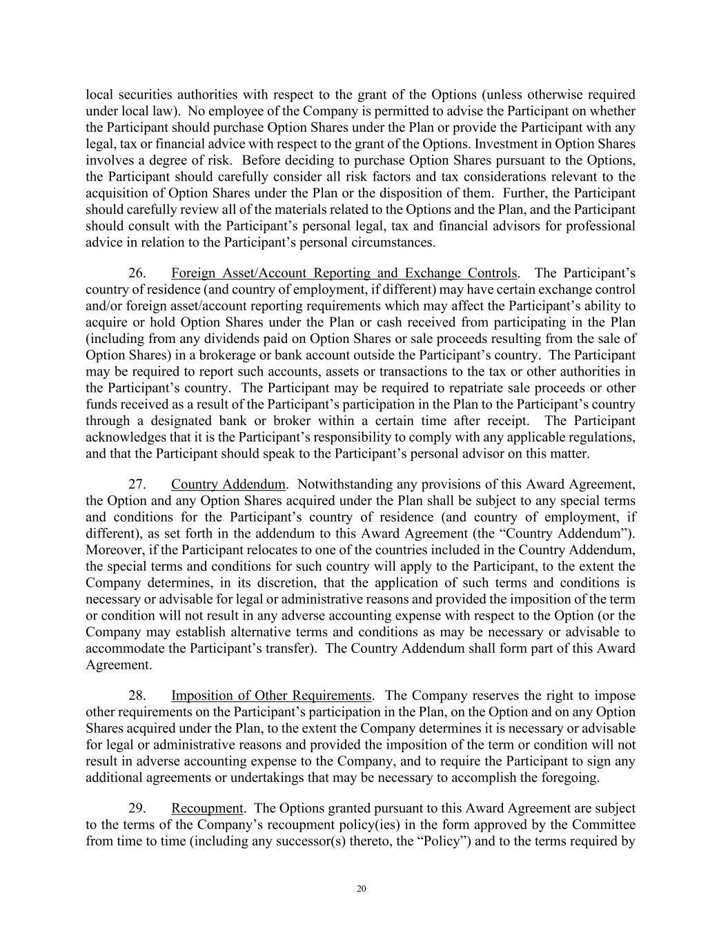 20 local securities authorities with respect to the grant of the Options (unless otherwise required under local law). No employee of the Company is permitted to advise the Participant on whether the Participant should purchase Option Shares under the Plan or provide the Participant with any legal, tax or financial advice with respect to the grant of the Options. Investment in Option Shares involves a degree of risk. Before deciding to purchase Option Shares pursuant to the Options, the Participant should carefully consider all risk factors and tax considerations relevant to the acquisition of Option Shares under the Plan or the disposition of them. Further, the Participant should carefully review all of the materials related to the Options and the Plan, and the Participant should consult with the Participant’s personal legal, tax and financial advisors for professional advice in relation to the Participant’s personal circumstances. 26. Foreign Asset/Account Reporting and Exchange Controls. The Participant’s country of residence (and country of employment, if different) may have certain exchange control and/or foreign asset/account reporting requirements which may affect the Participant’s ability to acquire or hold Option Shares under the Plan or cash received from participating in the Plan (including from any dividends paid on Option Shares or sale proceeds resulting from the sale of Option Shares) in a brokerage or bank account outside the Participant’s country. The Participant may be required to report such accounts, assets or transactions to the tax or other authorities in the Participant’s country. The Participant may be required to repatriate sale proceeds or other funds received as a result of the Participant’s participation in the Plan to the Participant’s country through a designated bank or broker within a certain time after receipt. The Participant acknowledges that it is the Participant’s responsibility to comply with any applicable regulations, and that the Participant should speak to the Participant’s personal advisor on this matter. 27. Country Addendum. Notwithstanding any provisions of this Award Agreement, the Option and any Option Shares acquired under the Plan shall be subject to any special terms and conditions for the Participant’s country of residence (and country of employment, if different), as set forth in the addendum to this Award Agreement (the “Country Addendum”). Moreover, if the Participant relocates to one of the countries included in the Country Addendum, the special terms and conditions for such country will apply to the Participant, to the extent the Company determines, in its discretion, that the application of such terms and conditions is necessary or advisable for legal or administrative reasons and provided the imposition of the term or condition will not result in any adverse accounting expense with respect to the Option (or the Company may establish alternative terms and conditions as may be necessary or advisable to accommodate the Participant’s transfer). The Country Addendum shall form part of this Award Agreement. 28. Imposition of Other Requirements. The Company reserves the right to impose other requirements on the Participant’s participation in the Plan, on the Option and on any Option Shares acquired under the Plan, to the extent the Company determines it is necessary or advisable for legal or administrative reasons and provided the imposition of the term or condition will not result in adverse accounting expense to the Company, and to require the Participant to sign any additional agreements or undertakings that may be necessary to accomplish the foregoing. 29. Recoupment. The Options granted pursuant to this Award Agreement are subject to the terms of the Company’s recoupment policy(ies) in the form approved by the Committee from time to time (including any successor(s) thereto, the “Policy”) and to the terms required by