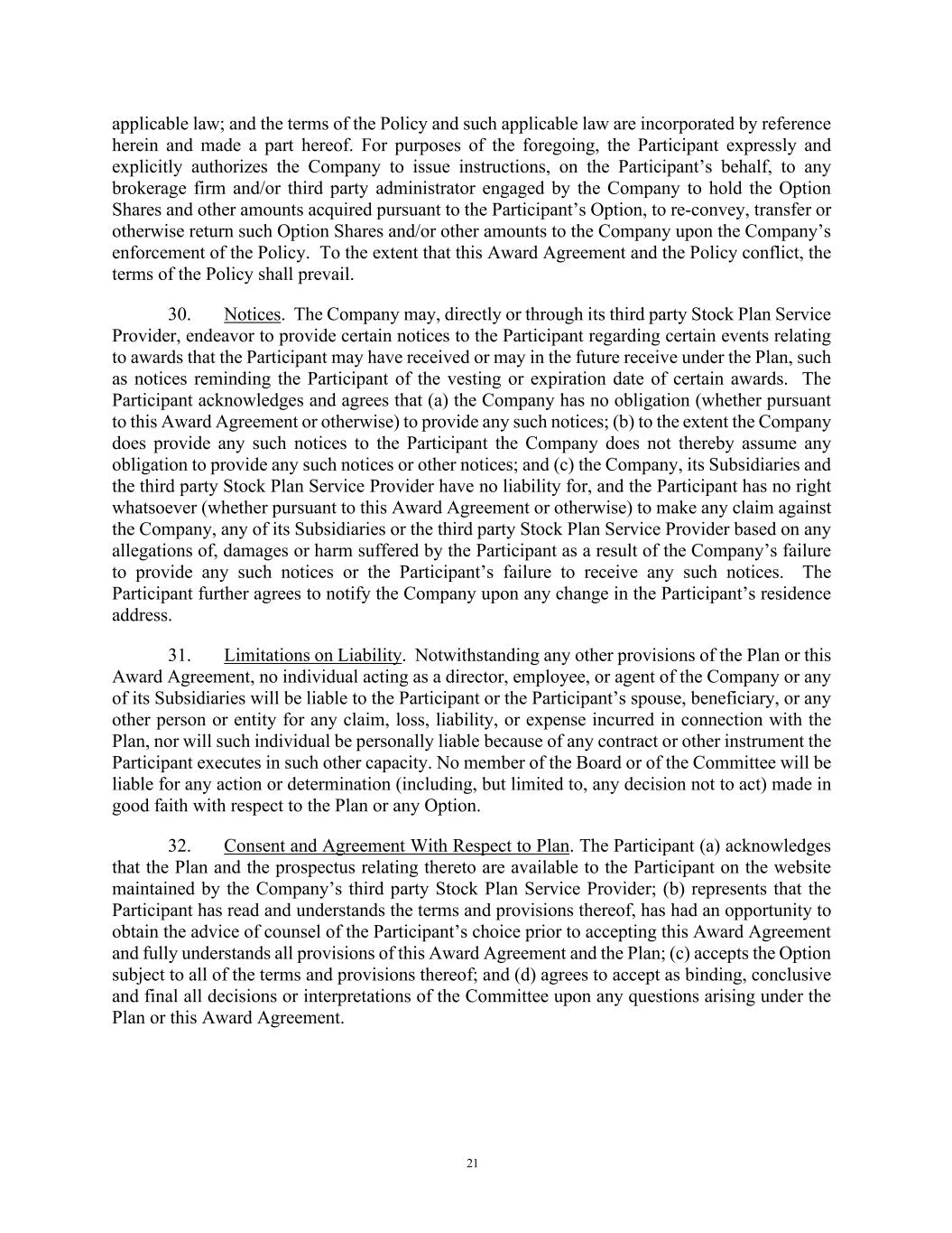 21 applicable law; and the terms of the Policy and such applicable law are incorporated by reference herein and made a part hereof. For purposes of the foregoing, the Participant expressly and explicitly authorizes the Company to issue instructions, on the Participant’s behalf, to any brokerage firm and/or third party administrator engaged by the Company to hold the Option Shares and other amounts acquired pursuant to the Participant’s Option, to re-convey, transfer or otherwise return such Option Shares and/or other amounts to the Company upon the Company’s enforcement of the Policy. To the extent that this Award Agreement and the Policy conflict, the terms of the Policy shall prevail. 30. Notices. The Company may, directly or through its third party Stock Plan Service Provider, endeavor to provide certain notices to the Participant regarding certain events relating to awards that the Participant may have received or may in the future receive under the Plan, such as notices reminding the Participant of the vesting or expiration date of certain awards. The Participant acknowledges and agrees that (a) the Company has no obligation (whether pursuant to this Award Agreement or otherwise) to provide any such notices; (b) to the extent the Company does provide any such notices to the Participant the Company does not thereby assume any obligation to provide any such notices or other notices; and (c) the Company, its Subsidiaries and the third party Stock Plan Service Provider have no liability for, and the Participant has no right whatsoever (whether pursuant to this Award Agreement or otherwise) to make any claim against the Company, any of its Subsidiaries or the third party Stock Plan Service Provider based on any allegations of, damages or harm suffered by the Participant as a result of the Company’s failure to provide any such notices or the Participant’s failure to receive any such notices. The Participant further agrees to notify the Company upon any change in the Participant’s residence address. 31. Limitations on Liability. Notwithstanding any other provisions of the Plan or this Award Agreement, no individual acting as a director, employee, or agent of the Company or any of its Subsidiaries will be liable to the Participant or the Participant’s spouse, beneficiary, or any other person or entity for any claim, loss, liability, or expense incurred in connection with the Plan, nor will such individual be personally liable because of any contract or other instrument the Participant executes in such other capacity. No member of the Board or of the Committee will be liable for any action or determination (including, but limited to, any decision not to act) made in good faith with respect to the Plan or any Option. 32. Consent and Agreement With Respect to Plan. The Participant (a) acknowledges that the Plan and the prospectus relating thereto are available to the Participant on the website maintained by the Company’s third party Stock Plan Service Provider; (b) represents that the Participant has read and understands the terms and provisions thereof, has had an opportunity to obtain the advice of counsel of the Participant’s choice prior to accepting this Award Agreement and fully understands all provisions of this Award Agreement and the Plan; (c) accepts the Option subject to all of the terms and provisions thereof; and (d) agrees to accept as binding, conclusive and final all decisions or interpretations of the Committee upon any questions arising under the Plan or this Award Agreement.