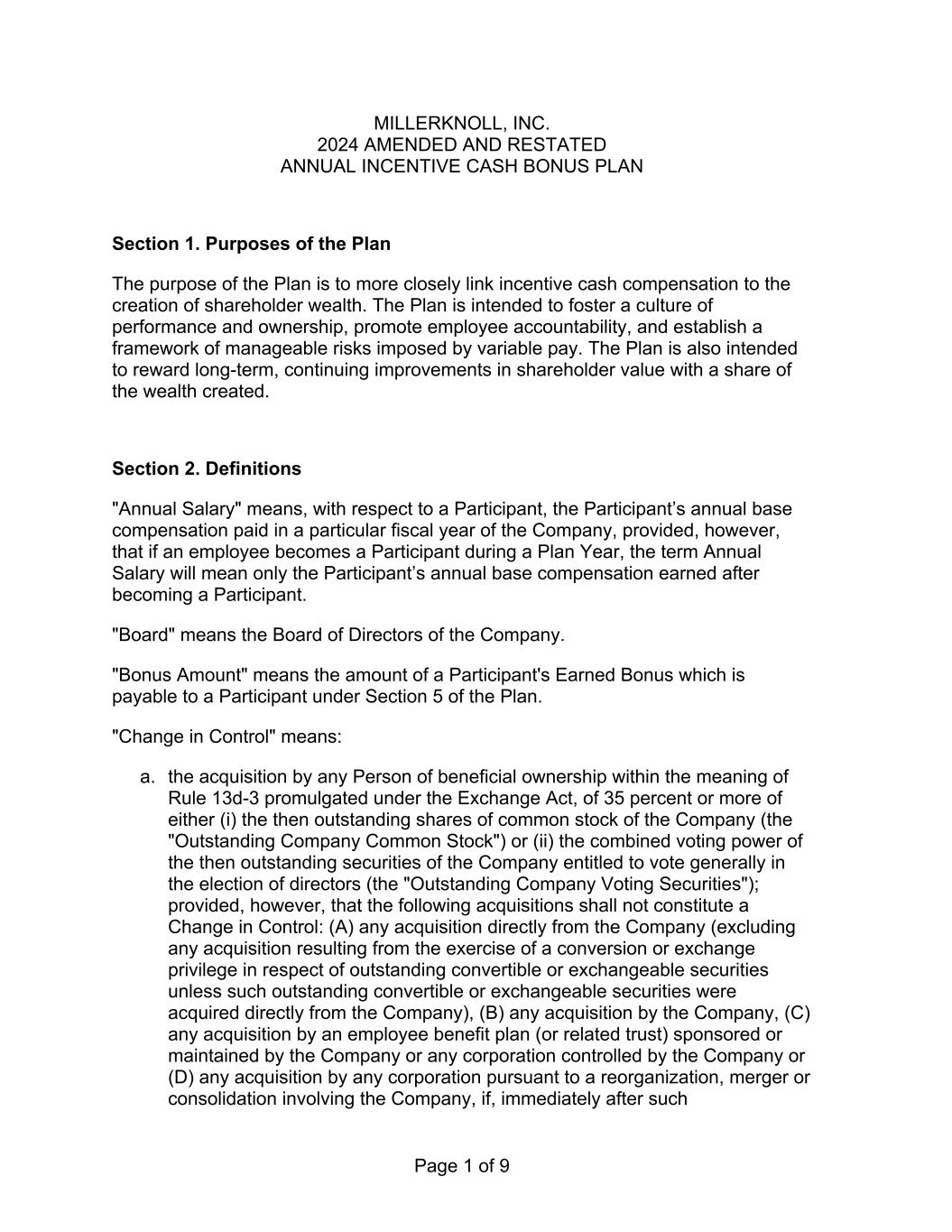 Page 1 of 9 MILLERKNOLL, INC. 2024 AMENDED AND RESTATED ANNUAL INCENTIVE CASH BONUS PLAN Section 1. Purposes of the Plan The purpose of the Plan is to more closely link incentive cash compensation to the creation of shareholder wealth. The Plan is intended to foster a culture of performance and ownership, promote employee accountability, and establish a framework of manageable risks imposed by variable pay. The Plan is also intended to reward long-term, continuing improvements in shareholder value with a share of the wealth created. Section 2. Definitions "Annual Salary" means, with respect to a Participant, the Participant’s annual base compensation paid in a particular fiscal year of the Company, provided, however, that if an employee becomes a Participant during a Plan Year, the term Annual Salary will mean only the Participant’s annual base compensation earned after becoming a Participant. "Board" means the Board of Directors of the Company. "Bonus Amount" means the amount of a Participant's Earned Bonus which is payable to a Participant under Section 5 of the Plan. "Change in Control" means: a. the acquisition by any Person of beneficial ownership within the meaning of Rule 13d-3 promulgated under the Exchange Act, of 35 percent or more of either (i) the then outstanding shares of common stock of the Company (the "Outstanding Company Common Stock") or (ii) the combined voting power of the then outstanding securities of the Company entitled to vote generally in the election of directors (the "Outstanding Company Voting Securities"); provided, however, that the following acquisitions shall not constitute a Change in Control: (A) any acquisition directly from the Company (excluding any acquisition resulting from the exercise of a conversion or exchange privilege in respect of outstanding convertible or exchangeable securities unless such outstanding convertible or exchangeable securities were acquired directly from the Company), (B) any acquisition by the Company, (C) any acquisition by an employee benefit plan (or related trust) sponsored or maintained by the Company or any corporation controlled by the Company or (D) any acquisition by any corporation pursuant to a reorganization, merger or consolidation involving the Company, if, immediately after such