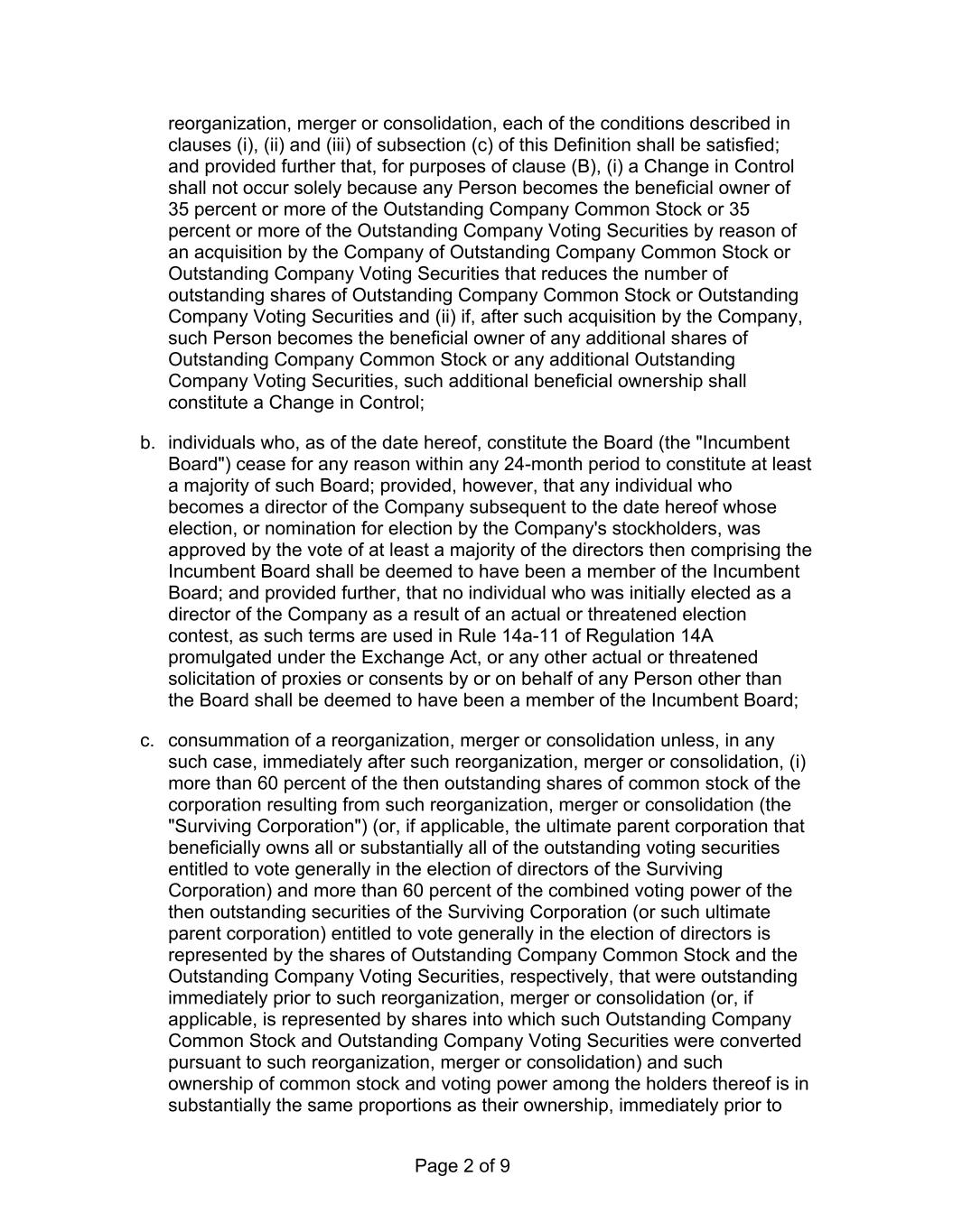 Page 2 of 9 reorganization, merger or consolidation, each of the conditions described in clauses (i), (ii) and (iii) of subsection (c) of this Definition shall be satisfied; and provided further that, for purposes of clause (B), (i) a Change in Control shall not occur solely because any Person becomes the beneficial owner of 35 percent or more of the Outstanding Company Common Stock or 35 percent or more of the Outstanding Company Voting Securities by reason of an acquisition by the Company of Outstanding Company Common Stock or Outstanding Company Voting Securities that reduces the number of outstanding shares of Outstanding Company Common Stock or Outstanding Company Voting Securities and (ii) if, after such acquisition by the Company, such Person becomes the beneficial owner of any additional shares of Outstanding Company Common Stock or any additional Outstanding Company Voting Securities, such additional beneficial ownership shall constitute a Change in Control; b. individuals who, as of the date hereof, constitute the Board (the "Incumbent Board") cease for any reason within any 24-month period to constitute at least a majority of such Board; provided, however, that any individual who becomes a director of the Company subsequent to the date hereof whose election, or nomination for election by the Company's stockholders, was approved by the vote of at least a majority of the directors then comprising the Incumbent Board shall be deemed to have been a member of the Incumbent Board; and provided further, that no individual who was initially elected as a director of the Company as a result of an actual or threatened election contest, as such terms are used in Rule 14a-11 of Regulation 14A promulgated under the Exchange Act, or any other actual or threatened solicitation of proxies or consents by or on behalf of any Person other than the Board shall be deemed to have been a member of the Incumbent Board; c. consummation of a reorganization, merger or consolidation unless, in any such case, immediately after such reorganization, merger or consolidation, (i) more than 60 percent of the then outstanding shares of common stock of the corporation resulting from such reorganization, merger or consolidation (the "Surviving Corporation") (or, if applicable, the ultimate parent corporation that beneficially owns all or substantially all of the outstanding voting securities entitled to vote generally in the election of directors of the Surviving Corporation) and more than 60 percent of the combined voting power of the then outstanding securities of the Surviving Corporation (or such ultimate parent corporation) entitled to vote generally in the election of directors is represented by the shares of Outstanding Company Common Stock and the Outstanding Company Voting Securities, respectively, that were outstanding immediately prior to such reorganization, merger or consolidation (or, if applicable, is represented by shares into which such Outstanding Company Common Stock and Outstanding Company Voting Securities were converted pursuant to such reorganization, merger or consolidation) and such ownership of common stock and voting power among the holders thereof is in substantially the same proportions as their ownership, immediately prior to