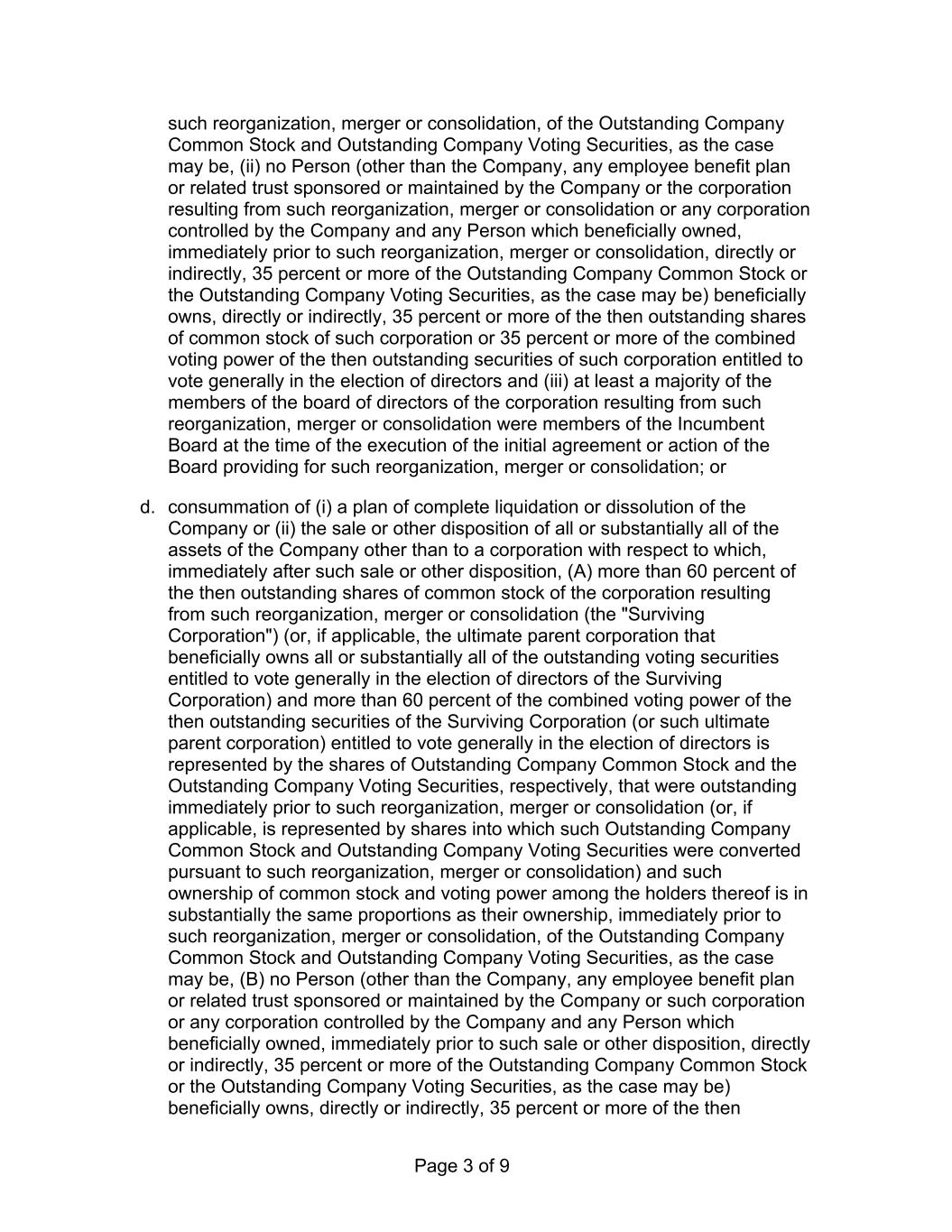 Page 3 of 9 such reorganization, merger or consolidation, of the Outstanding Company Common Stock and Outstanding Company Voting Securities, as the case may be, (ii) no Person (other than the Company, any employee benefit plan or related trust sponsored or maintained by the Company or the corporation resulting from such reorganization, merger or consolidation or any corporation controlled by the Company and any Person which beneficially owned, immediately prior to such reorganization, merger or consolidation, directly or indirectly, 35 percent or more of the Outstanding Company Common Stock or the Outstanding Company Voting Securities, as the case may be) beneficially owns, directly or indirectly, 35 percent or more of the then outstanding shares of common stock of such corporation or 35 percent or more of the combined voting power of the then outstanding securities of such corporation entitled to vote generally in the election of directors and (iii) at least a majority of the members of the board of directors of the corporation resulting from such reorganization, merger or consolidation were members of the Incumbent Board at the time of the execution of the initial agreement or action of the Board providing for such reorganization, merger or consolidation; or d. consummation of (i) a plan of complete liquidation or dissolution of the Company or (ii) the sale or other disposition of all or substantially all of the assets of the Company other than to a corporation with respect to which, immediately after such sale or other disposition, (A) more than 60 percent of the then outstanding shares of common stock of the corporation resulting from such reorganization, merger or consolidation (the "Surviving Corporation") (or, if applicable, the ultimate parent corporation that beneficially owns all or substantially all of the outstanding voting securities entitled to vote generally in the election of directors of the Surviving Corporation) and more than 60 percent of the combined voting power of the then outstanding securities of the Surviving Corporation (or such ultimate parent corporation) entitled to vote generally in the election of directors is represented by the shares of Outstanding Company Common Stock and the Outstanding Company Voting Securities, respectively, that were outstanding immediately prior to such reorganization, merger or consolidation (or, if applicable, is represented by shares into which such Outstanding Company Common Stock and Outstanding Company Voting Securities were converted pursuant to such reorganization, merger or consolidation) and such ownership of common stock and voting power among the holders thereof is in substantially the same proportions as their ownership, immediately prior to such reorganization, merger or consolidation, of the Outstanding Company Common Stock and Outstanding Company Voting Securities, as the case may be, (B) no Person (other than the Company, any employee benefit plan or related trust sponsored or maintained by the Company or such corporation or any corporation controlled by the Company and any Person which beneficially owned, immediately prior to such sale or other disposition, directly or indirectly, 35 percent or more of the Outstanding Company Common Stock or the Outstanding Company Voting Securities, as the case may be) beneficially owns, directly or indirectly, 35 percent or more of the then