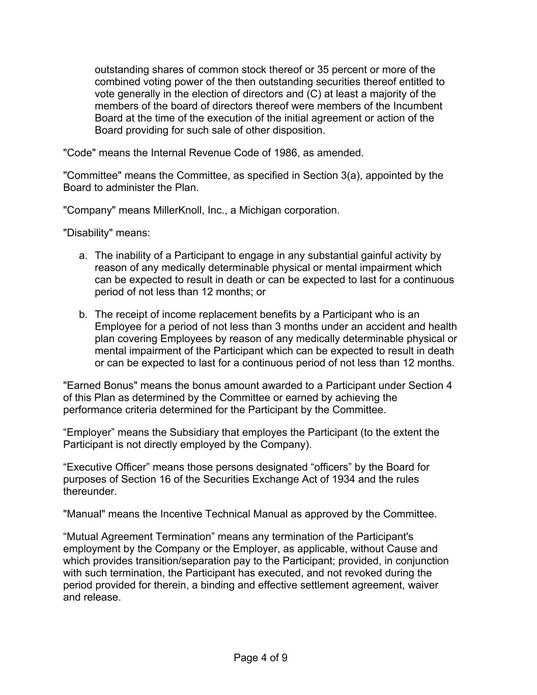 Page 4 of 9 outstanding shares of common stock thereof or 35 percent or more of the combined voting power of the then outstanding securities thereof entitled to vote generally in the election of directors and (C) at least a majority of the members of the board of directors thereof were members of the Incumbent Board at the time of the execution of the initial agreement or action of the Board providing for such sale of other disposition. "Code" means the Internal Revenue Code of 1986, as amended. "Committee" means the Committee, as specified in Section 3(a), appointed by the Board to administer the Plan. "Company" means MillerKnoll, Inc., a Michigan corporation. "Disability" means: a. The inability of a Participant to engage in any substantial gainful activity by reason of any medically determinable physical or mental impairment which can be expected to result in death or can be expected to last for a continuous period of not less than 12 months; or b. The receipt of income replacement benefits by a Participant who is an Employee for a period of not less than 3 months under an accident and health plan covering Employees by reason of any medically determinable physical or mental impairment of the Participant which can be expected to result in death or can be expected to last for a continuous period of not less than 12 months. "Earned Bonus" means the bonus amount awarded to a Participant under Section 4 of this Plan as determined by the Committee or earned by achieving the performance criteria determined for the Participant by the Committee. “Employer” means the Subsidiary that employes the Participant (to the extent the Participant is not directly employed by the Company). “Executive Officer” means those persons designated “officers” by the Board for purposes of Section 16 of the Securities Exchange Act of 1934 and the rules thereunder. "Manual" means the Incentive Technical Manual as approved by the Committee. “Mutual Agreement Termination” means any termination of the Participant's employment by the Company or the Employer, as applicable, without Cause and which provides transition/separation pay to the Participant; provided, in conjunction with such termination, the Participant has executed, and not revoked during the period provided for therein, a binding and effective settlement agreement, waiver and release.