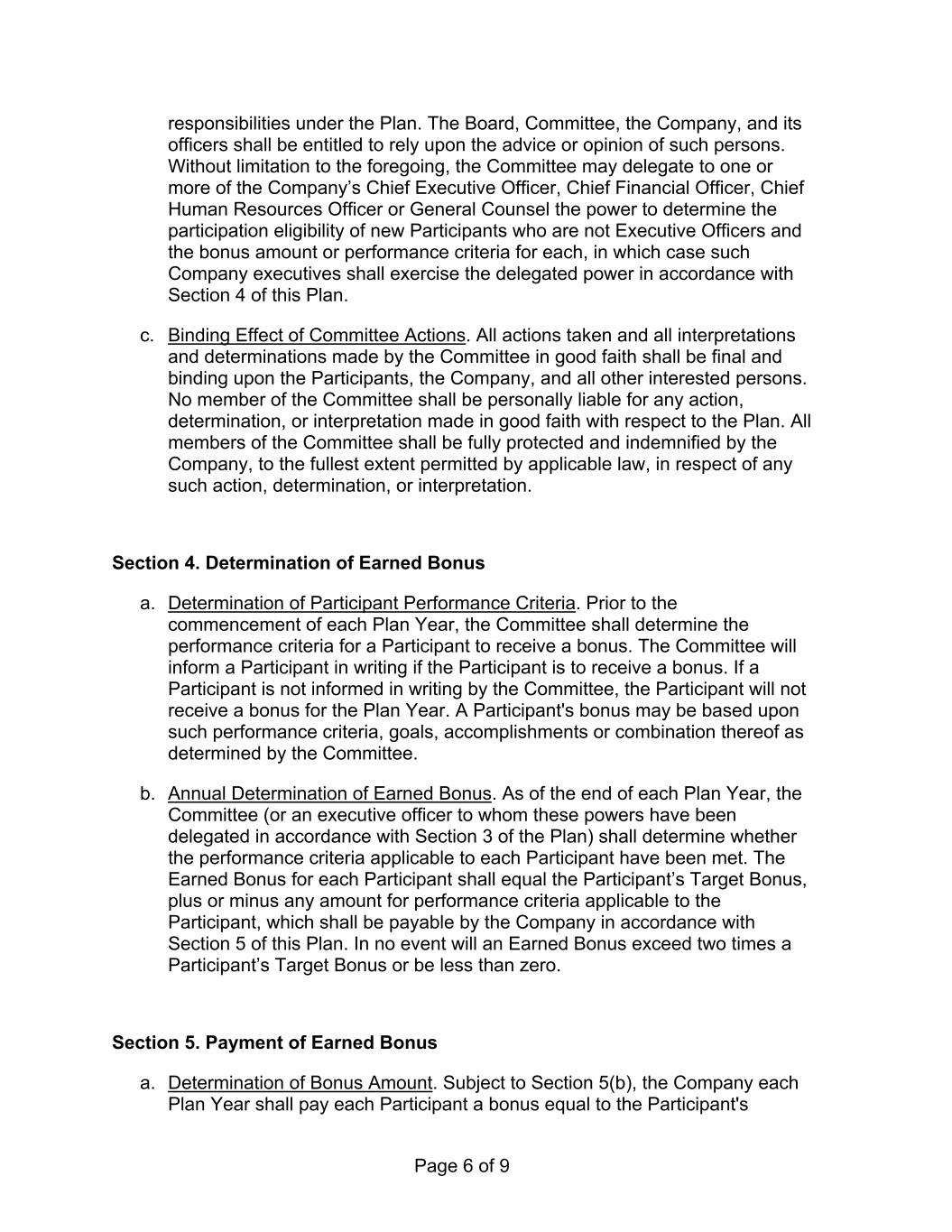 Page 6 of 9 responsibilities under the Plan. The Board, Committee, the Company, and its officers shall be entitled to rely upon the advice or opinion of such persons. Without limitation to the foregoing, the Committee may delegate to one or more of the Company’s Chief Executive Officer, Chief Financial Officer, Chief Human Resources Officer or General Counsel the power to determine the participation eligibility of new Participants who are not Executive Officers and the bonus amount or performance criteria for each, in which case such Company executives shall exercise the delegated power in accordance with Section 4 of this Plan. c. Binding Effect of Committee Actions. All actions taken and all interpretations and determinations made by the Committee in good faith shall be final and binding upon the Participants, the Company, and all other interested persons. No member of the Committee shall be personally liable for any action, determination, or interpretation made in good faith with respect to the Plan. All members of the Committee shall be fully protected and indemnified by the Company, to the fullest extent permitted by applicable law, in respect of any such action, determination, or interpretation. Section 4. Determination of Earned Bonus a. Determination of Participant Performance Criteria. Prior to the commencement of each Plan Year, the Committee shall determine the performance criteria for a Participant to receive a bonus. The Committee will inform a Participant in writing if the Participant is to receive a bonus. If a Participant is not informed in writing by the Committee, the Participant will not receive a bonus for the Plan Year. A Participant's bonus may be based upon such performance criteria, goals, accomplishments or combination thereof as determined by the Committee. b. Annual Determination of Earned Bonus. As of the end of each Plan Year, the Committee (or an executive officer to whom these powers have been delegated in accordance with Section 3 of the Plan) shall determine whether the performance criteria applicable to each Participant have been met. The Earned Bonus for each Participant shall equal the Participant’s Target Bonus, plus or minus any amount for performance criteria applicable to the Participant, which shall be payable by the Company in accordance with Section 5 of this Plan. In no event will an Earned Bonus exceed two times a Participant’s Target Bonus or be less than zero. Section 5. Payment of Earned Bonus a. Determination of Bonus Amount. Subject to Section 5(b), the Company each Plan Year shall pay each Participant a bonus equal to the Participant's