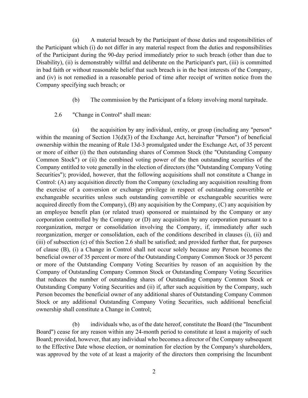 2 (a) A material breach by the Participant of those duties and responsibilities of the Participant which (i) do not differ in any material respect from the duties and responsibilities of the Participant during the 90-day period immediately prior to such breach (other than due to Disability), (ii) is demonstrably willful and deliberate on the Participant's part, (iii) is committed in bad faith or without reasonable belief that such breach is in the best interests of the Company, and (iv) is not remedied in a reasonable period of time after receipt of written notice from the Company specifying such breach; or (b) The commission by the Participant of a felony involving moral turpitude. 2.6 "Change in Control" shall mean: (a) the acquisition by any individual, entity, or group (including any "person" within the meaning of Section 13(d)(3) of the Exchange Act, hereinafter "Person") of beneficial ownership within the meaning of Rule 13d-3 promulgated under the Exchange Act, of 35 percent or more of either (i) the then outstanding shares of Common Stock (the "Outstanding Company Common Stock") or (ii) the combined voting power of the then outstanding securities of the Company entitled to vote generally in the election of directors (the "Outstanding Company Voting Securities"); provided, however, that the following acquisitions shall not constitute a Change in Control: (A) any acquisition directly from the Company (excluding any acquisition resulting from the exercise of a conversion or exchange privilege in respect of outstanding convertible or exchangeable securities unless such outstanding convertible or exchangeable securities were acquired directly from the Company), (B) any acquisition by the Company, (C) any acquisition by an employee benefit plan (or related trust) sponsored or maintained by the Company or any corporation controlled by the Company or (D) any acquisition by any corporation pursuant to a reorganization, merger or consolidation involving the Company, if, immediately after such reorganization, merger or consolidation, each of the conditions described in clauses (i), (ii) and (iii) of subsection (c) of this Section 2.6 shall be satisfied; and provided further that, for purposes of clause (B), (i) a Change in Control shall not occur solely because any Person becomes the beneficial owner of 35 percent or more of the Outstanding Company Common Stock or 35 percent or more of the Outstanding Company Voting Securities by reason of an acquisition by the Company of Outstanding Company Common Stock or Outstanding Company Voting Securities that reduces the number of outstanding shares of Outstanding Company Common Stock or Outstanding Company Voting Securities and (ii) if, after such acquisition by the Company, such Person becomes the beneficial owner of any additional shares of Outstanding Company Common Stock or any additional Outstanding Company Voting Securities, such additional beneficial ownership shall constitute a Change in Control; (b) individuals who, as of the date hereof, constitute the Board (the "Incumbent Board") cease for any reason within any 24-month period to constitute at least a majority of such Board; provided, however, that any individual who becomes a director of the Company subsequent to the Effective Date whose election, or nomination for election by the Company's shareholders, was approved by the vote of at least a majority of the directors then comprising the Incumbent