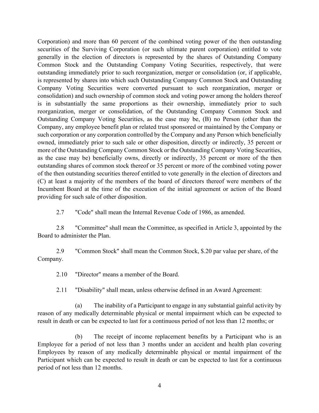 4 Corporation) and more than 60 percent of the combined voting power of the then outstanding securities of the Surviving Corporation (or such ultimate parent corporation) entitled to vote generally in the election of directors is represented by the shares of Outstanding Company Common Stock and the Outstanding Company Voting Securities, respectively, that were outstanding immediately prior to such reorganization, merger or consolidation (or, if applicable, is represented by shares into which such Outstanding Company Common Stock and Outstanding Company Voting Securities were converted pursuant to such reorganization, merger or consolidation) and such ownership of common stock and voting power among the holders thereof is in substantially the same proportions as their ownership, immediately prior to such reorganization, merger or consolidation, of the Outstanding Company Common Stock and Outstanding Company Voting Securities, as the case may be, (B) no Person (other than the Company, any employee benefit plan or related trust sponsored or maintained by the Company or such corporation or any corporation controlled by the Company and any Person which beneficially owned, immediately prior to such sale or other disposition, directly or indirectly, 35 percent or more of the Outstanding Company Common Stock or the Outstanding Company Voting Securities, as the case may be) beneficially owns, directly or indirectly, 35 percent or more of the then outstanding shares of common stock thereof or 35 percent or more of the combined voting power of the then outstanding securities thereof entitled to vote generally in the election of directors and (C) at least a majority of the members of the board of directors thereof were members of the Incumbent Board at the time of the execution of the initial agreement or action of the Board providing for such sale of other disposition. 2.7 "Code" shall mean the Internal Revenue Code of 1986, as amended. 2.8 "Committee" shall mean the Committee, as specified in Article 3, appointed by the Board to administer the Plan. 2.9 "Common Stock" shall mean the Common Stock, $.20 par value per share, of the Company. 2.10 "Director" means a member of the Board. 2.11 "Disability" shall mean, unless otherwise defined in an Award Agreement: (a) The inability of a Participant to engage in any substantial gainful activity by reason of any medically determinable physical or mental impairment which can be expected to result in death or can be expected to last for a continuous period of not less than 12 months; or (b) The receipt of income replacement benefits by a Participant who is an Employee for a period of not less than 3 months under an accident and health plan covering Employees by reason of any medically determinable physical or mental impairment of the Participant which can be expected to result in death or can be expected to last for a continuous period of not less than 12 months.