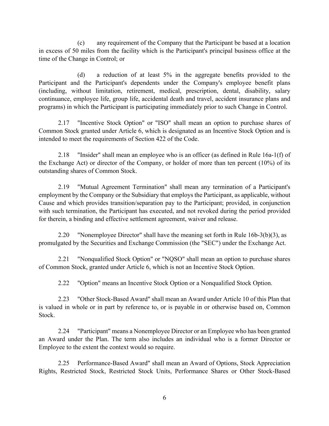 6 (c) any requirement of the Company that the Participant be based at a location in excess of 50 miles from the facility which is the Participant's principal business office at the time of the Change in Control; or (d) a reduction of at least 5% in the aggregate benefits provided to the Participant and the Participant's dependents under the Company's employee benefit plans (including, without limitation, retirement, medical, prescription, dental, disability, salary continuance, employee life, group life, accidental death and travel, accident insurance plans and programs) in which the Participant is participating immediately prior to such Change in Control. 2.17 "Incentive Stock Option" or "ISO" shall mean an option to purchase shares of Common Stock granted under Article 6, which is designated as an Incentive Stock Option and is intended to meet the requirements of Section 422 of the Code. 2.18 "Insider" shall mean an employee who is an officer (as defined in Rule 16a-1(f) of the Exchange Act) or director of the Company, or holder of more than ten percent (10%) of its outstanding shares of Common Stock. 2.19 "Mutual Agreement Termination" shall mean any termination of a Participant's employment by the Company or the Subsidiary that employs the Participant, as applicable, without Cause and which provides transition/separation pay to the Participant; provided, in conjunction with such termination, the Participant has executed, and not revoked during the period provided for therein, a binding and effective settlement agreement, waiver and release. 2.20 "Nonemployee Director" shall have the meaning set forth in Rule 16b-3(b)(3), as promulgated by the Securities and Exchange Commission (the "SEC") under the Exchange Act. 2.21 "Nonqualified Stock Option" or "NQSO" shall mean an option to purchase shares of Common Stock, granted under Article 6, which is not an Incentive Stock Option. 2.22 "Option" means an Incentive Stock Option or a Nonqualified Stock Option. 2.23 "Other Stock-Based Award" shall mean an Award under Article 10 of this Plan that is valued in whole or in part by reference to, or is payable in or otherwise based on, Common Stock. 2.24 "Participant" means a Nonemployee Director or an Employee who has been granted an Award under the Plan. The term also includes an individual who is a former Director or Employee to the extent the context would so require. 2.25 Performance-Based Award" shall mean an Award of Options, Stock Appreciation Rights, Restricted Stock, Restricted Stock Units, Performance Shares or Other Stock-Based