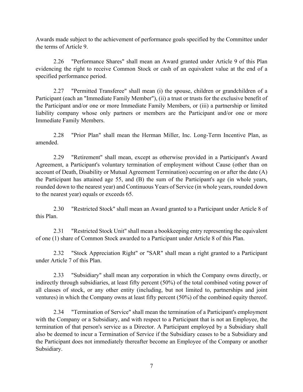 7 Awards made subject to the achievement of performance goals specified by the Committee under the terms of Article 9. 2.26 "Performance Shares" shall mean an Award granted under Article 9 of this Plan evidencing the right to receive Common Stock or cash of an equivalent value at the end of a specified performance period. 2.27 "Permitted Transferee" shall mean (i) the spouse, children or grandchildren of a Participant (each an "Immediate Family Member"), (ii) a trust or trusts for the exclusive benefit of the Participant and/or one or more Immediate Family Members, or (iii) a partnership or limited liability company whose only partners or members are the Participant and/or one or more Immediate Family Members. 2.28 "Prior Plan" shall mean the Herman Miller, Inc. Long-Term Incentive Plan, as amended. 2.29 "Retirement" shall mean, except as otherwise provided in a Participant's Award Agreement, a Participant's voluntary termination of employment without Cause (other than on account of Death, Disability or Mutual Agreement Termination) occurring on or after the date (A) the Participant has attained age 55, and (B) the sum of the Participant's age (in whole years, rounded down to the nearest year) and Continuous Years of Service (in whole years, rounded down to the nearest year) equals or exceeds 65. 2.30 "Restricted Stock" shall mean an Award granted to a Participant under Article 8 of this Plan. 2.31 "Restricted Stock Unit" shall mean a bookkeeping entry representing the equivalent of one (1) share of Common Stock awarded to a Participant under Article 8 of this Plan. 2.32 "Stock Appreciation Right" or "SAR" shall mean a right granted to a Participant under Article 7 of this Plan. 2.33 "Subsidiary" shall mean any corporation in which the Company owns directly, or indirectly through subsidiaries, at least fifty percent (50%) of the total combined voting power of all classes of stock, or any other entity (including, but not limited to, partnerships and joint ventures) in which the Company owns at least fifty percent (50%) of the combined equity thereof. 2.34 "Termination of Service" shall mean the termination of a Participant's employment with the Company or a Subsidiary, and with respect to a Participant that is not an Employee, the termination of that person's service as a Director. A Participant employed by a Subsidiary shall also be deemed to incur a Termination of Service if the Subsidiary ceases to be a Subsidiary and the Participant does not immediately thereafter become an Employee of the Company or another Subsidiary.