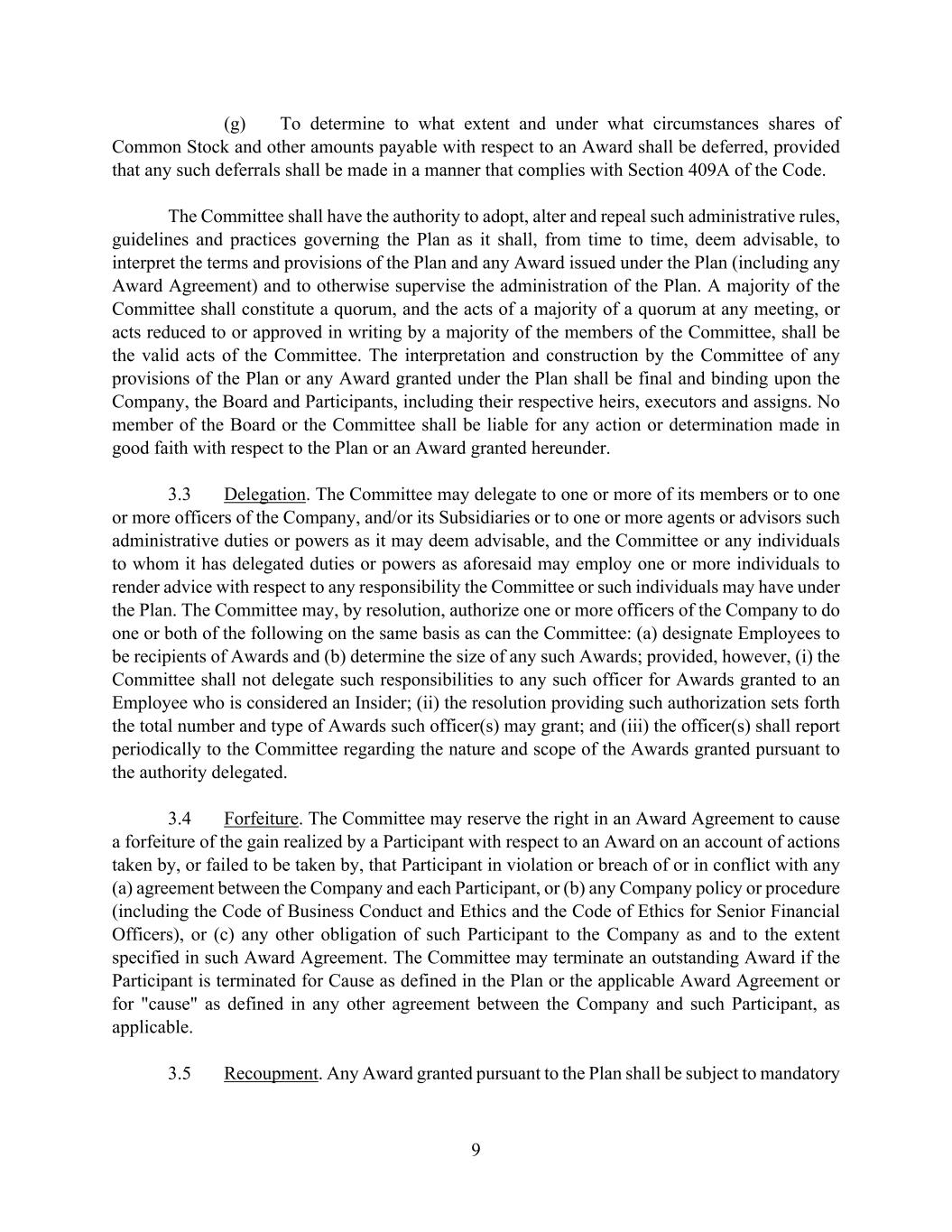 9 (g) To determine to what extent and under what circumstances shares of Common Stock and other amounts payable with respect to an Award shall be deferred, provided that any such deferrals shall be made in a manner that complies with Section 409A of the Code. The Committee shall have the authority to adopt, alter and repeal such administrative rules, guidelines and practices governing the Plan as it shall, from time to time, deem advisable, to interpret the terms and provisions of the Plan and any Award issued under the Plan (including any Award Agreement) and to otherwise supervise the administration of the Plan. A majority of the Committee shall constitute a quorum, and the acts of a majority of a quorum at any meeting, or acts reduced to or approved in writing by a majority of the members of the Committee, shall be the valid acts of the Committee. The interpretation and construction by the Committee of any provisions of the Plan or any Award granted under the Plan shall be final and binding upon the Company, the Board and Participants, including their respective heirs, executors and assigns. No member of the Board or the Committee shall be liable for any action or determination made in good faith with respect to the Plan or an Award granted hereunder. 3.3 Delegation. The Committee may delegate to one or more of its members or to one or more officers of the Company, and/or its Subsidiaries or to one or more agents or advisors such administrative duties or powers as it may deem advisable, and the Committee or any individuals to whom it has delegated duties or powers as aforesaid may employ one or more individuals to render advice with respect to any responsibility the Committee or such individuals may have under the Plan. The Committee may, by resolution, authorize one or more officers of the Company to do one or both of the following on the same basis as can the Committee: (a) designate Employees to be recipients of Awards and (b) determine the size of any such Awards; provided, however, (i) the Committee shall not delegate such responsibilities to any such officer for Awards granted to an Employee who is considered an Insider; (ii) the resolution providing such authorization sets forth the total number and type of Awards such officer(s) may grant; and (iii) the officer(s) shall report periodically to the Committee regarding the nature and scope of the Awards granted pursuant to the authority delegated. 3.4 Forfeiture. The Committee may reserve the right in an Award Agreement to cause a forfeiture of the gain realized by a Participant with respect to an Award on an account of actions taken by, or failed to be taken by, that Participant in violation or breach of or in conflict with any (a) agreement between the Company and each Participant, or (b) any Company policy or procedure (including the Code of Business Conduct and Ethics and the Code of Ethics for Senior Financial Officers), or (c) any other obligation of such Participant to the Company as and to the extent specified in such Award Agreement. The Committee may terminate an outstanding Award if the Participant is terminated for Cause as defined in the Plan or the applicable Award Agreement or for "cause" as defined in any other agreement between the Company and such Participant, as applicable. 3.5 Recoupment. Any Award granted pursuant to the Plan shall be subject to mandatory