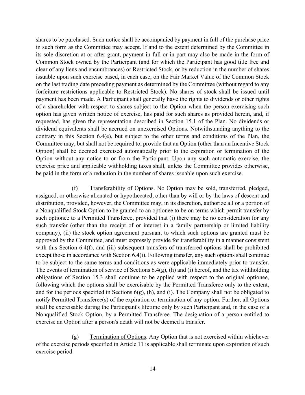 14 shares to be purchased. Such notice shall be accompanied by payment in full of the purchase price in such form as the Committee may accept. If and to the extent determined by the Committee in its sole discretion at or after grant, payment in full or in part may also be made in the form of Common Stock owned by the Participant (and for which the Participant has good title free and clear of any liens and encumbrances) or Restricted Stock, or by reduction in the number of shares issuable upon such exercise based, in each case, on the Fair Market Value of the Common Stock on the last trading date preceding payment as determined by the Committee (without regard to any forfeiture restrictions applicable to Restricted Stock). No shares of stock shall be issued until payment has been made. A Participant shall generally have the rights to dividends or other rights of a shareholder with respect to shares subject to the Option when the person exercising such option has given written notice of exercise, has paid for such shares as provided herein, and, if requested, has given the representation described in Section 15.1 of the Plan. No dividends or dividend equivalents shall be accrued on unexercised Options. Notwithstanding anything to the contrary in this Section 6.4(e), but subject to the other terms and conditions of the Plan, the Committee may, but shall not be required to, provide that an Option (other than an Incentive Stock Option) shall be deemed exercised automatically prior to the expiration or termination of the Option without any notice to or from the Participant. Upon any such automatic exercise, the exercise price and applicable withholding taxes shall, unless the Committee provides otherwise, be paid in the form of a reduction in the number of shares issuable upon such exercise. (f) Transferability of Options. No Option may be sold, transferred, pledged, assigned, or otherwise alienated or hypothecated, other than by will or by the laws of descent and distribution, provided, however, the Committee may, in its discretion, authorize all or a portion of a Nonqualified Stock Option to be granted to an optionee to be on terms which permit transfer by such optionee to a Permitted Transferee, provided that (i) there may be no consideration for any such transfer (other than the receipt of or interest in a family partnership or limited liability company), (ii) the stock option agreement pursuant to which such options are granted must be approved by the Committee, and must expressly provide for transferability in a manner consistent with this Section 6.4(f), and (iii) subsequent transfers of transferred options shall be prohibited except those in accordance with Section 6.4(i). Following transfer, any such options shall continue to be subject to the same terms and conditions as were applicable immediately prior to transfer. The events of termination of service of Sections 6.4(g), (h) and (i) hereof, and the tax withholding obligations of Section 15.3 shall continue to be applied with respect to the original optionee, following which the options shall be exercisable by the Permitted Transferee only to the extent, and for the periods specified in Sections 6(g), (h), and (i). The Company shall not be obligated to notify Permitted Transferee(s) of the expiration or termination of any option. Further, all Options shall be exercisable during the Participant's lifetime only by such Participant and, in the case of a Nonqualified Stock Option, by a Permitted Transferee. The designation of a person entitled to exercise an Option after a person's death will not be deemed a transfer. (g) Termination of Options. Any Option that is not exercised within whichever of the exercise periods specified in Article 11 is applicable shall terminate upon expiration of such exercise period.
