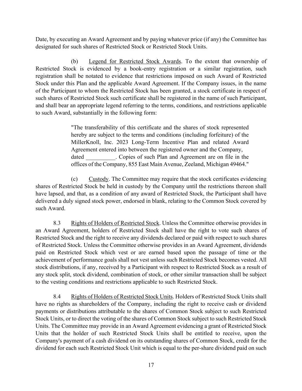 17 Date, by executing an Award Agreement and by paying whatever price (if any) the Committee has designated for such shares of Restricted Stock or Restricted Stock Units. (b) Legend for Restricted Stock Awards. To the extent that ownership of Restricted Stock is evidenced by a book-entry registration or a similar registration, such registration shall be notated to evidence that restrictions imposed on such Award of Restricted Stock under this Plan and the applicable Award Agreement. If the Company issues, in the name of the Participant to whom the Restricted Stock has been granted, a stock certificate in respect of such shares of Restricted Stock such certificate shall be registered in the name of such Participant, and shall bear an appropriate legend referring to the terms, conditions, and restrictions applicable to such Award, substantially in the following form: "The transferability of this certificate and the shares of stock represented hereby are subject to the terms and conditions (including forfeiture) of the MillerKnoll, Inc. 2023 Long-Term Incentive Plan and related Award Agreement entered into between the registered owner and the Company, dated __________. Copies of such Plan and Agreement are on file in the offices of the Company, 855 East Main Avenue, Zeeland, Michigan 49464." (c) Custody. The Committee may require that the stock certificates evidencing shares of Restricted Stock be held in custody by the Company until the restrictions thereon shall have lapsed, and that, as a condition of any award of Restricted Stock, the Participant shall have delivered a duly signed stock power, endorsed in blank, relating to the Common Stock covered by such Award. 8.3 Rights of Holders of Restricted Stock. Unless the Committee otherwise provides in an Award Agreement, holders of Restricted Stock shall have the right to vote such shares of Restricted Stock and the right to receive any dividends declared or paid with respect to such shares of Restricted Stock. Unless the Committee otherwise provides in an Award Agreement, dividends paid on Restricted Stock which vest or are earned based upon the passage of time or the achievement of performance goals shall not vest unless such Restricted Stock becomes vested. All stock distributions, if any, received by a Participant with respect to Restricted Stock as a result of any stock split, stock dividend, combination of stock, or other similar transaction shall be subject to the vesting conditions and restrictions applicable to such Restricted Stock. 8.4 Rights of Holders of Restricted Stock Units. Holders of Restricted Stock Units shall have no rights as shareholders of the Company, including the right to receive cash or dividend payments or distributions attributable to the shares of Common Stock subject to such Restricted Stock Units, or to direct the voting of the shares of Common Stock subject to such Restricted Stock Units. The Committee may provide in an Award Agreement evidencing a grant of Restricted Stock Units that the holder of such Restricted Stock Units shall be entitled to receive, upon the Company's payment of a cash dividend on its outstanding shares of Common Stock, credit for the dividend for each such Restricted Stock Unit which is equal to the per-share dividend paid on such