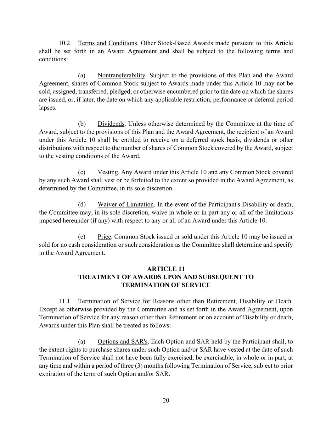 20 10.2 Terms and Conditions. Other Stock-Based Awards made pursuant to this Article shall be set forth in an Award Agreement and shall be subject to the following terms and conditions: (a) Nontransferability. Subject to the provisions of this Plan and the Award Agreement, shares of Common Stock subject to Awards made under this Article 10 may not be sold, assigned, transferred, pledged, or otherwise encumbered prior to the date on which the shares are issued, or, if later, the date on which any applicable restriction, performance or deferral period lapses. (b) Dividends. Unless otherwise determined by the Committee at the time of Award, subject to the provisions of this Plan and the Award Agreement, the recipient of an Award under this Article 10 shall be entitled to receive on a deferred stock basis, dividends or other distributions with respect to the number of shares of Common Stock covered by the Award, subject to the vesting conditions of the Award. (c) Vesting. Any Award under this Article 10 and any Common Stock covered by any such Award shall vest or be forfeited to the extent so provided in the Award Agreement, as determined by the Committee, in its sole discretion. (d) Waiver of Limitation. In the event of the Participant's Disability or death, the Committee may, in its sole discretion, waive in whole or in part any or all of the limitations imposed hereunder (if any) with respect to any or all of an Award under this Article 10. (e) Price. Common Stock issued or sold under this Article 10 may be issued or sold for no cash consideration or such consideration as the Committee shall determine and specify in the Award Agreement. ARTICLE 11 TREATMENT OF AWARDS UPON AND SUBSEQUENT TO TERMINATION OF SERVICE 11.1 Termination of Service for Reasons other than Retirement, Disability or Death. Except as otherwise provided by the Committee and as set forth in the Award Agreement, upon Termination of Service for any reason other than Retirement or on account of Disability or death, Awards under this Plan shall be treated as follows: (a) Options and SAR's. Each Option and SAR held by the Participant shall, to the extent rights to purchase shares under such Option and/or SAR have vested at the date of such Termination of Service shall not have been fully exercised, be exercisable, in whole or in part, at any time and within a period of three (3) months following Termination of Service, subject to prior expiration of the term of such Option and/or SAR.