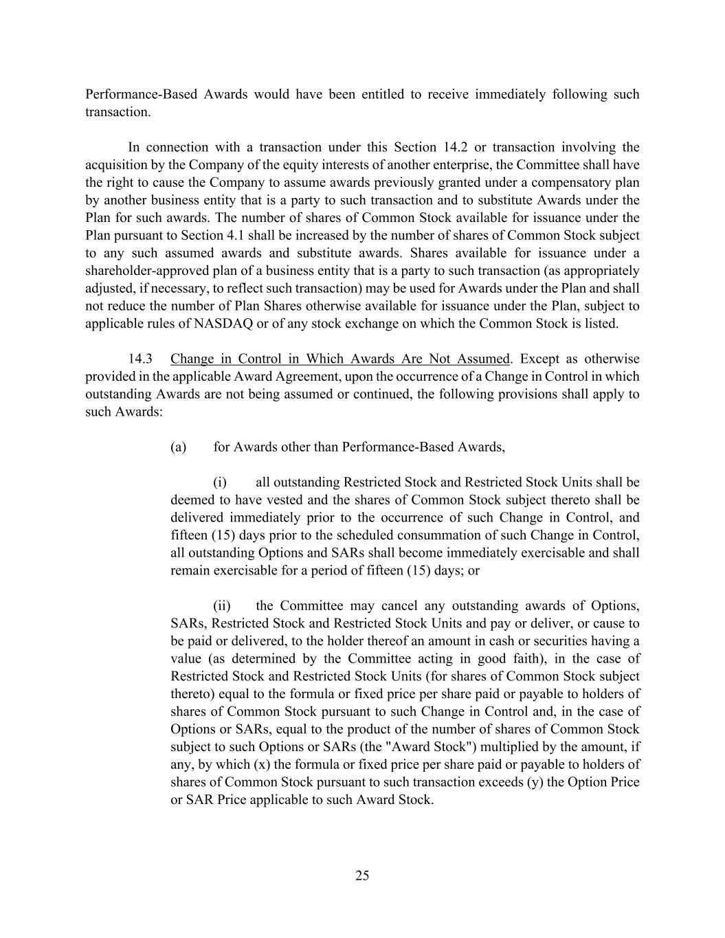 25 Performance-Based Awards would have been entitled to receive immediately following such transaction. In connection with a transaction under this Section 14.2 or transaction involving the acquisition by the Company of the equity interests of another enterprise, the Committee shall have the right to cause the Company to assume awards previously granted under a compensatory plan by another business entity that is a party to such transaction and to substitute Awards under the Plan for such awards. The number of shares of Common Stock available for issuance under the Plan pursuant to Section 4.1 shall be increased by the number of shares of Common Stock subject to any such assumed awards and substitute awards. Shares available for issuance under a shareholder-approved plan of a business entity that is a party to such transaction (as appropriately adjusted, if necessary, to reflect such transaction) may be used for Awards under the Plan and shall not reduce the number of Plan Shares otherwise available for issuance under the Plan, subject to applicable rules of NASDAQ or of any stock exchange on which the Common Stock is listed. 14.3 Change in Control in Which Awards Are Not Assumed. Except as otherwise provided in the applicable Award Agreement, upon the occurrence of a Change in Control in which outstanding Awards are not being assumed or continued, the following provisions shall apply to such Awards: (a) for Awards other than Performance-Based Awards, (i) all outstanding Restricted Stock and Restricted Stock Units shall be deemed to have vested and the shares of Common Stock subject thereto shall be delivered immediately prior to the occurrence of such Change in Control, and fifteen (15) days prior to the scheduled consummation of such Change in Control, all outstanding Options and SARs shall become immediately exercisable and shall remain exercisable for a period of fifteen (15) days; or (ii) the Committee may cancel any outstanding awards of Options, SARs, Restricted Stock and Restricted Stock Units and pay or deliver, or cause to be paid or delivered, to the holder thereof an amount in cash or securities having a value (as determined by the Committee acting in good faith), in the case of Restricted Stock and Restricted Stock Units (for shares of Common Stock subject thereto) equal to the formula or fixed price per share paid or payable to holders of shares of Common Stock pursuant to such Change in Control and, in the case of Options or SARs, equal to the product of the number of shares of Common Stock subject to such Options or SARs (the "Award Stock") multiplied by the amount, if any, by which (x) the formula or fixed price per share paid or payable to holders of shares of Common Stock pursuant to such transaction exceeds (y) the Option Price or SAR Price applicable to such Award Stock.