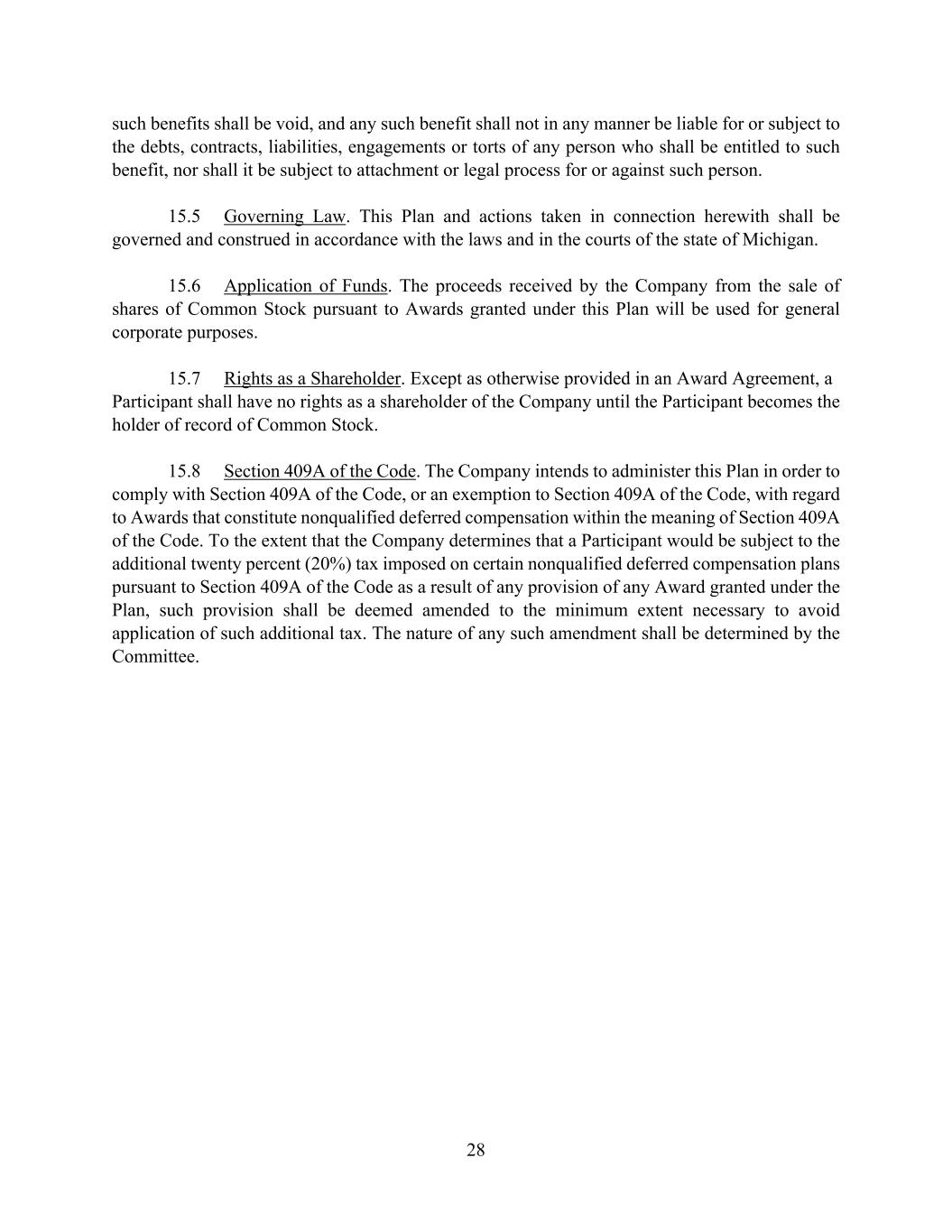28 such benefits shall be void, and any such benefit shall not in any manner be liable for or subject to the debts, contracts, liabilities, engagements or torts of any person who shall be entitled to such benefit, nor shall it be subject to attachment or legal process for or against such person. 15.5 Governing Law. This Plan and actions taken in connection herewith shall be governed and construed in accordance with the laws and in the courts of the state of Michigan. 15.6 Application of Funds. The proceeds received by the Company from the sale of shares of Common Stock pursuant to Awards granted under this Plan will be used for general corporate purposes. 15.7 Rights as a Shareholder. Except as otherwise provided in an Award Agreement, a Participant shall have no rights as a shareholder of the Company until the Participant becomes the holder of record of Common Stock. 15.8 Section 409A of the Code. The Company intends to administer this Plan in order to comply with Section 409A of the Code, or an exemption to Section 409A of the Code, with regard to Awards that constitute nonqualified deferred compensation within the meaning of Section 409A of the Code. To the extent that the Company determines that a Participant would be subject to the additional twenty percent (20%) tax imposed on certain nonqualified deferred compensation plans pursuant to Section 409A of the Code as a result of any provision of any Award granted under the Plan, such provision shall be deemed amended to the minimum extent necessary to avoid application of such additional tax. The nature of any such amendment shall be determined by the Committee.