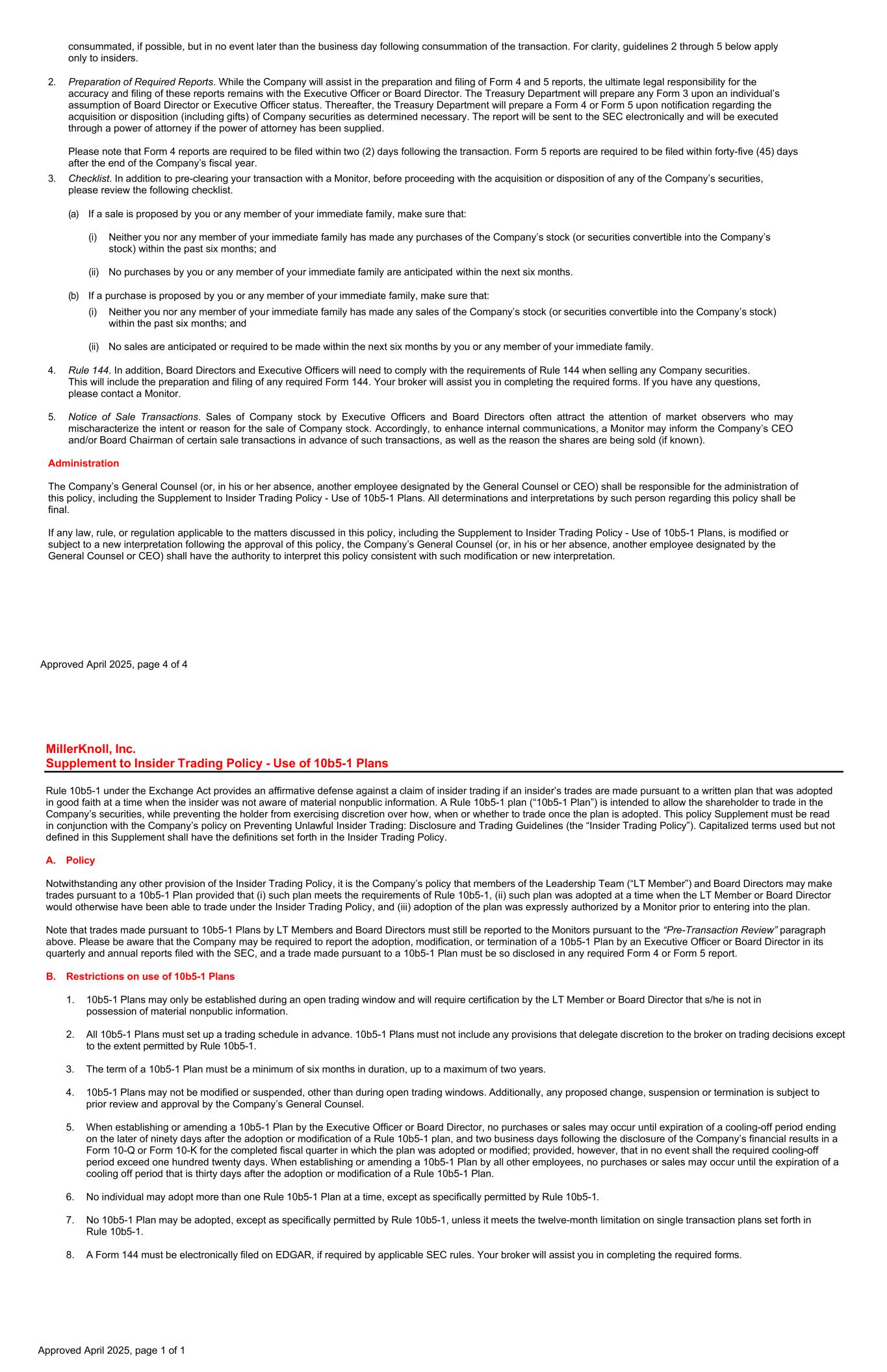 Approved April 2025, page 4 of 4 consummated, if possible, but in no event later than the business day following consummation of the transaction. For clarity, guidelines 2 through 5 below apply only to insiders. 2. Preparation of Required Reports. While the Company will assist in the preparation and filing of Form 4 and 5 reports, the ultimate legal responsibility for the accuracy and filing of these reports remains with the Executive Officer or Board Director. The Treasury Department will prepare any Form 3 upon an individual’s assumption of Board Director or Executive Officer status. Thereafter, the Treasury Department will prepare a Form 4 or Form 5 upon notification regarding the acquisition or disposition (including gifts) of Company securities as determined necessary. The report will be sent to the SEC electronically and will be executed through a power of attorney if the power of attorney has been supplied. Please note that Form 4 reports are required to be filed within two (2) days following the transaction. Form 5 reports are required to be filed within forty-five (45) days after the end of the Company’s fiscal year. 3. Checklist. In addition to pre-clearing your transaction with a Monitor, before proceeding with the acquisition or disposition of any of the Company’s securities, please review the following checklist. (a) If a sale is proposed by you or any member of your immediate family, make sure that: (i) Neither you nor any member of your immediate family has made any purchases of the Company’s stock (or securities convertible into the Company’s stock) within the past six months; and (ii) No purchases by you or any member of your immediate family are anticipated within the next six months. (b) If a purchase is proposed by you or any member of your immediate family, make sure that: (i) Neither you nor any member of your immediate family has made any sales of the Company’s stock (or securities convertible into the Company’s stock) within the past six months; and (ii) No sales are anticipated or required to be made within the next six months by you or any member of your immediate family. 4. Rule 144. In addition, Board Directors and Executive Officers will need to comply with the requirements of Rule 144 when selling any Company securities. This will include the preparation and filing of any required Form 144. Your broker will assist you in completing the required forms. If you have any questions, please contact a Monitor. 5. Notice of Sale Transactions. Sales of Company stock by Executive Officers and Board Directors often attract the attention of market observers who may mischaracterize the intent or reason for the sale of Company stock. Accordingly, to enhance internal communications, a Monitor may inform the Company’s CEO and/or Board Chairman of certain sale transactions in advance of such transactions, as well as the reason the shares are being sold (if known). Administration The Company’s General Counsel (or, in his or her absence, another employee designated by the General Counsel or CEO) shall be responsible for the administration of this policy, including the Supplement to Insider Trading Policy - Use of 10b5-1 Plans. All determinations and interpretations by such person regarding this policy shall be final. If any law, rule, or regulation applicable to the matters discussed in this policy, including the Supplement to Insider Trading Policy - Use of 10b5-1 Plans, is modified or subject to a new interpretation following the approval of this policy, the Company’s General Counsel (or, in his or her absence, another employee designated by the General Counsel or CEO) shall have the authority to interpret this policy consistent with such modification or new interpretation. Approved April 2025, page 1 of 1 MillerKnoll, Inc. Supplement to Insider Trading Policy - Use of 10b5-1 Plans Rule 10b5-1 under the Exchange Act provides an affirmative defense against a claim of insider trading if an insider’s trades are made pursuant to a written plan that was adopted in good faith at a time when the insider was not aware of material nonpublic information. A Rule 10b5-1 plan (“10b5-1 Plan”) is intended to allow the shareholder to trade in the Company’s securities, while preventing the holder from exercising discretion over how, when or whether to trade once the plan is adopted. This policy Supplement must be read in conjunction with the Company’s policy on Preventing Unlawful Insider Trading: Disclosure and Trading Guidelines (the “Insider Trading Policy”). Capitalized terms used but not defined in this Supplement shall have the definitions set forth in the Insider Trading Policy. A. Policy Notwithstanding any other provision of the Insider Trading Policy, it is the Company’s policy that members of the Leadership Team (“LT Member”) and Board Directors may make trades pursuant to a 10b5-1 Plan provided that (i) such plan meets the requirements of Rule 10b5-1, (ii) such plan was adopted at a time when the LT Member or Board Director would otherwise have been able to trade under the Insider Trading Policy, and (iii) adoption of the plan was expressly authorized by a Monitor prior to entering into the plan. Note that trades made pursuant to 10b5-1 Plans by LT Members and Board Directors must still be reported to the Monitors pursuant to the “Pre-Transaction Review” paragraph above. Please be aware that the Company may be required to report the adoption, modification, or termination of a 10b5-1 Plan by an Executive Officer or Board Director in its quarterly and annual reports filed with the SEC, and a trade made pursuant to a 10b5-1 Plan must be so disclosed in any required Form 4 or Form 5 report. B. Restrictions on use of 10b5-1 Plans 1. 10b5-1 Plans may only be established during an open trading window and will require certification by the LT Member or Board Director that s/he is not in possession of material nonpublic information. 2. All 10b5-1