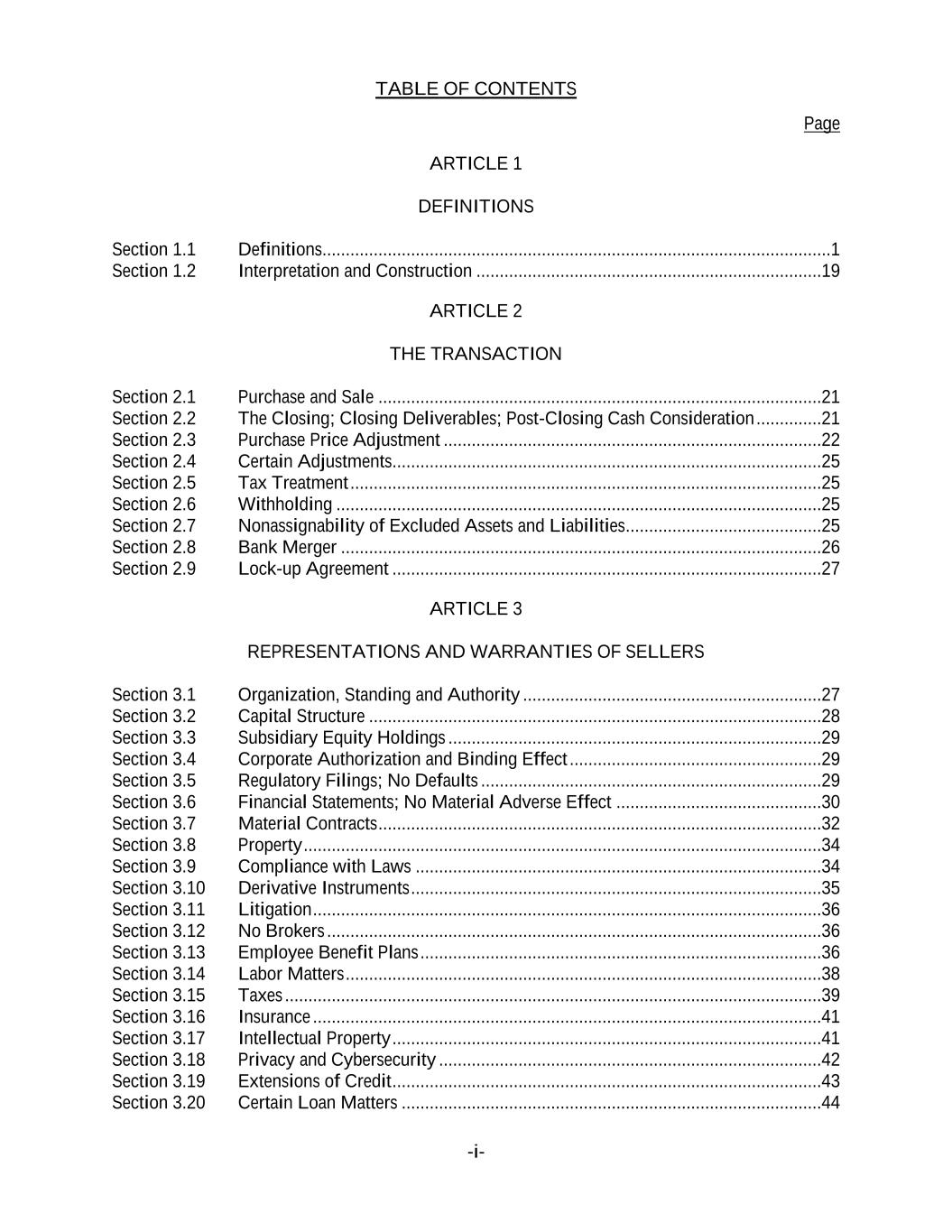 TABLE OF CONTENTS -i- Page ARTICLE 1 DEFINITIONS Section 1.1 Definitions.............................................................................................................1 Section 1.2 Interpretation and Construction ..........................................................................19 ARTICLE 2 THE TRANSACTION Section 2.1 Purchase and Sale ...............................................................................................21 Section 2.2 The Closing; Closing Deliverables; Post-Closing Cash Consideration ..............21 Section 2.3 Purchase Price Adjustment .................................................................................22 Section 2.4 Certain Adjustments............................................................................................25 Section 2.5 Tax Treatment .....................................................................................................25 Section 2.6 Withholding ........................................................................................................25 Section 2.7 Nonassignability of Excluded Assets and Liabilities ..........................................25 Section 2.8 Bank Merger .......................................................................................................26 Section 2.9 Lock-up Agreement ............................................................................................27 ARTICLE 3 REPRESENTATIONS AND WARRANTIES OF SELLERS Section 3.1 Organization, Standing and Authority ................................................................27 Section 3.2 Capital Structure .................................................................................................28 Section 3.3 Subsidiary Equity Holdings ................................................................................29 Section 3.4 Corporate Authorization and Binding Effect ......................................................29 Section 3.5 Regulatory Filings; No Defaults .........................................................................29 Section 3.6 Financial Statements; No Material Adverse Effect ............................................30 Section 3.7 Material Contracts ...............................................................................................32 Section 3.8 Property ...............................................................................................................34 Section 3.9 Compliance with Laws .......................................................................................34 Section 3.10 Derivative Instruments ........................................................................................35 Section 3.11 Litigation .............................................................................................................36 Section 3.12 No Brokers ..........................................................................................................36 Section 3.13 Employee Benefit Plans ......................................................................................36 Section 3.14 Labor Matters ......................................................................................................38 Section 3.15 Taxes ...................................................................................................................39 Section 3.16 Insurance .............................................................................................................41 Section 3.17 Intellectual Property ............................................................................................41 Section 3.18 Privacy and Cybersecurity ..................................................................................42 Section 3.19 Extensions of Credit ............................................................................................43 Section 3.20 Certain Loan Matters ..........................................................................................44