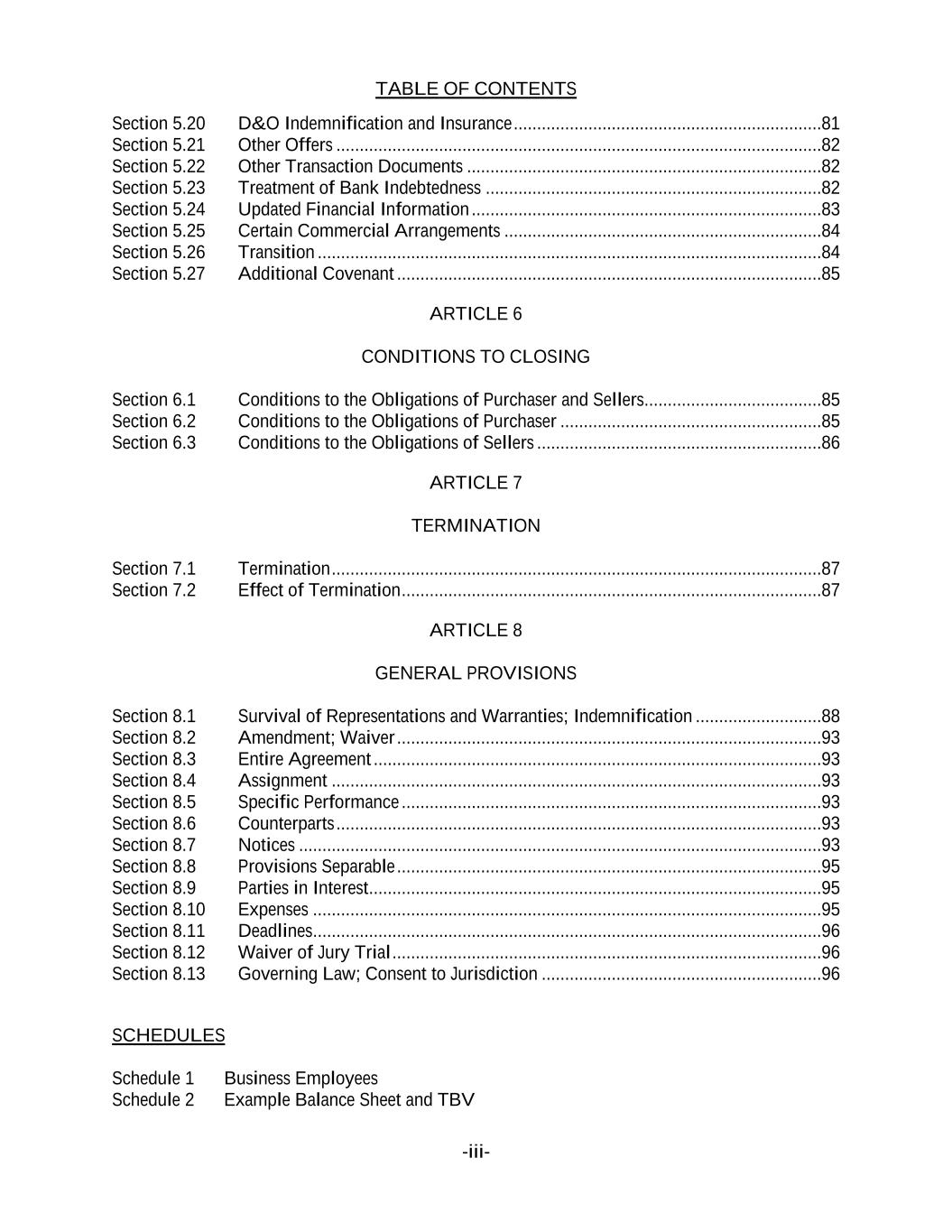 TABLE OF CONTENTS -iii- Section 5.20 D&O Indemnification and Insurance ..................................................................81 Section 5.21 Other Offers ........................................................................................................82 Section 5.22 Other Transaction Documents ............................................................................82 Section 5.23 Treatment of Bank Indebtedness ........................................................................82 Section 5.24 Updated Financial Information ...........................................................................83 Section 5.25 Certain Commercial Arrangements ....................................................................84 Section 5.26 Transition ............................................................................................................84 Section 5.27 Additional Covenant ...........................................................................................85 ARTICLE 6 CONDITIONS TO CLOSING Section 6.1 Conditions to the Obligations of Purchaser and Sellers......................................85 Section 6.2 Conditions to the Obligations of Purchaser ........................................................85 Section 6.3 Conditions to the Obligations of Sellers .............................................................86 ARTICLE 7 TERMINATION Section 7.1 Termination .........................................................................................................87 Section 7.2 Effect of Termination ..........................................................................................87 ARTICLE 8 GENERAL PROVISIONS Section 8.1 Survival of Representations and Warranties; Indemnification ...........................88 Section 8.2 Amendment; Waiver ...........................................................................................93 Section 8.3 Entire Agreement ................................................................................................93 Section 8.4 Assignment .........................................................................................................93 Section 8.5 Specific Performance ..........................................................................................93 Section 8.6 Counterparts ........................................................................................................93 Section 8.7 Notices ................................................................................................................93 Section 8.8 Provisions Separable ...........................................................................................95 Section 8.9 Parties in Interest.................................................................................................95 Section 8.10 Expenses .............................................................................................................95 Section 8.11 Deadlines.............................................................................................................96 Section 8.12 Waiver of Jury Trial ............................................................................................96 Section 8.13 Governing Law; Consent to Jurisdiction ............................................................96 SCHEDULES Schedule 1 Business Employees Schedule 2 Example Balance Sheet and TBV