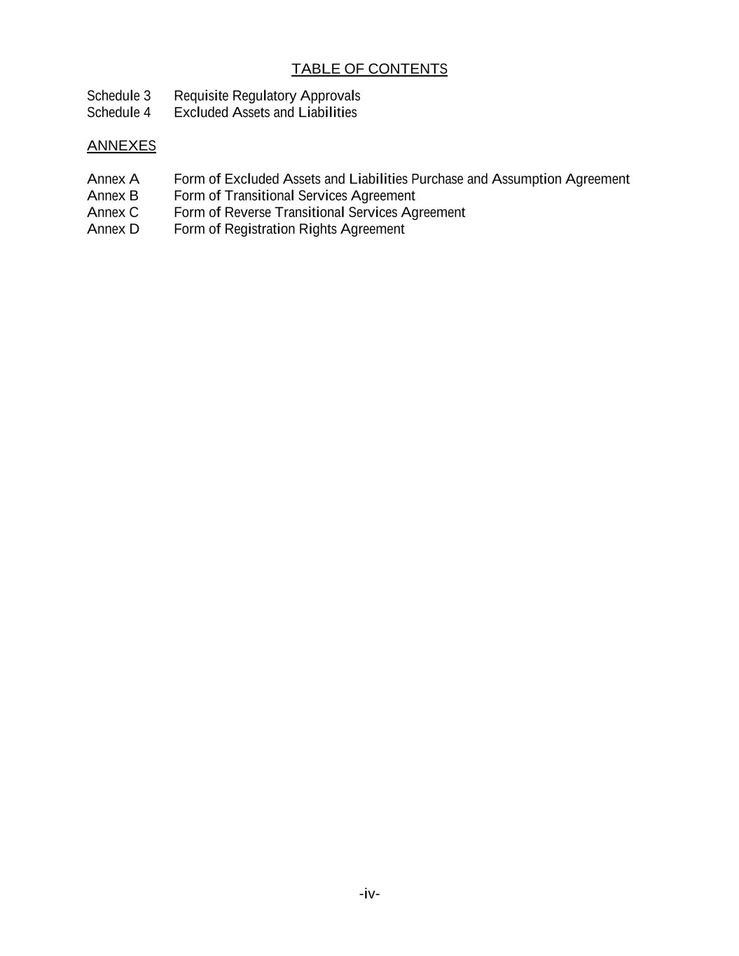 TABLE OF CONTENTS -iv- Schedule 3 Requisite Regulatory Approvals Schedule 4 Excluded Assets and Liabilities ANNEXES Annex A Form of Excluded Assets and Liabilities Purchase and Assumption Agreement Annex B Form of Transitional Services Agreement Annex C Form of Reverse Transitional Services Agreement Annex D Form of Registration Rights Agreement
