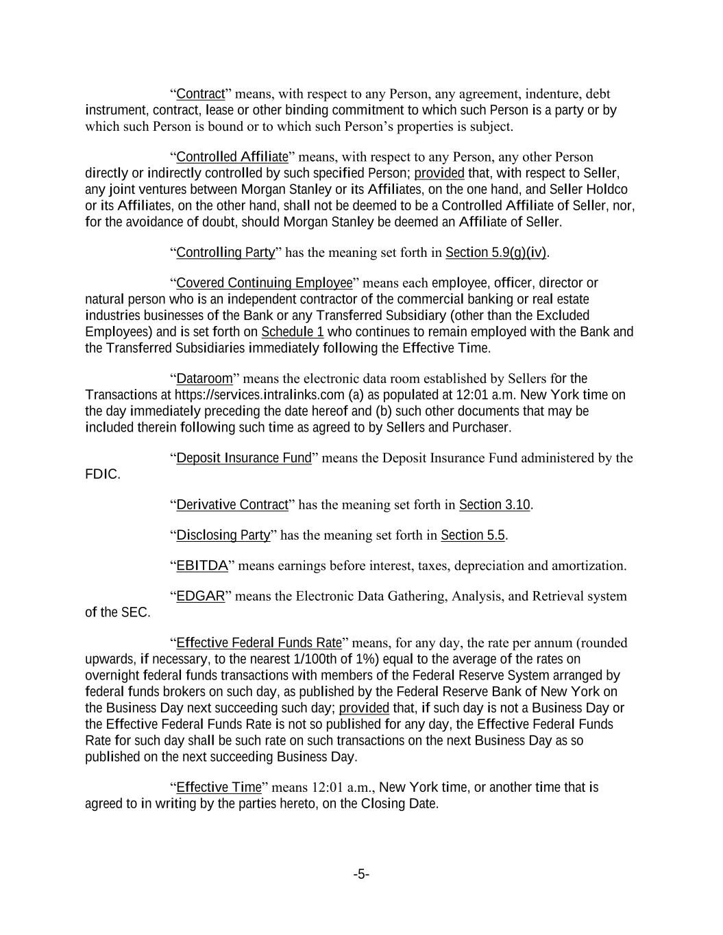 -5- “Contract” means, with respect to any Person, any agreement, indenture, debt instrument, contract, lease or other binding commitment to which such Person is a party or by which such Person is bound or to which such Person’s properties is subject. “Controlled Affiliate” means, with respect to any Person, any other Person directly or indirectly controlled by such specified Person; provided that, with respect to Seller, any joint ventures between Morgan Stanley or its Affiliates, on the one hand, and Seller Holdco or its Affiliates, on the other hand, shall not be deemed to be a Controlled Affiliate of Seller, nor, for the avoidance of doubt, should Morgan Stanley be deemed an Affiliate of Seller. “Controlling Party” has the meaning set forth in Section 5.9(g)(iv). “Covered Continuing Employee” means each employee, officer, director or natural person who is an independent contractor of the commercial banking or real estate industries businesses of the Bank or any Transferred Subsidiary (other than the Excluded Employees) and is set forth on Schedule 1 who continues to remain employed with the Bank and the Transferred Subsidiaries immediately following the Effective Time. “Dataroom” means the electronic data room established by Sellers for the Transactions at https://services.intralinks.com (a) as populated at 12:01 a.m. New York time on the day immediately preceding the date hereof and (b) such other documents that may be included therein following such time as agreed to by Sellers and Purchaser. “Deposit Insurance Fund” means the Deposit Insurance Fund administered by the FDIC. “Derivative Contract” has the meaning set forth in Section 3.10. “Disclosing Party” has the meaning set forth in Section 5.5. “EBITDA” means earnings before interest, taxes, depreciation and amortization. “EDGAR” means the Electronic Data Gathering, Analysis, and Retrieval system of the SEC. “Effective Federal Funds Rate” means, for any day, the rate per annum (rounded upwards, if necessary, to the nearest 1/100th of 1%) equal to the average of the rates on overnight federal funds transactions with members of the Federal Reserve System arranged by federal funds brokers on such day, as published by the Federal Reserve Bank of New York on the Business Day next succeeding such day; provided that, if such day is not a Business Day or the Effective Federal Funds Rate is not so published for any day, the Effective Federal Funds Rate for such day shall be such rate on such transactions on the next Business Day as so published on the next succeeding Business Day. “Effective Time” means 12:01 a.m., New York time, or another time that is agreed to in writing by the parties hereto, on the Closing Date.
