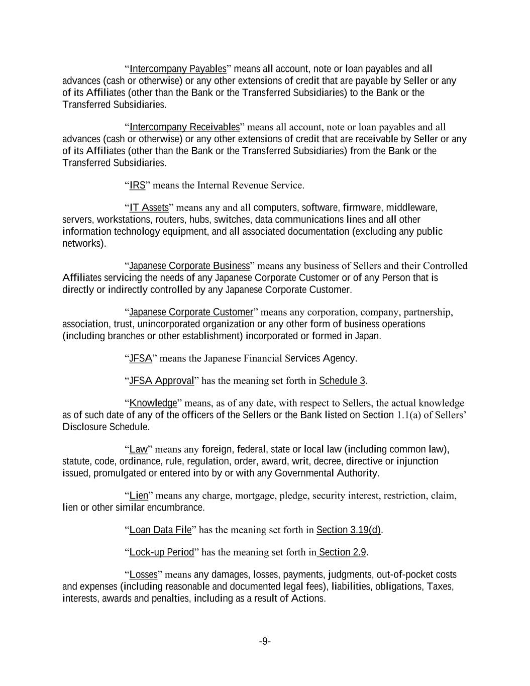 -9- “Intercompany Payables” means all account, note or loan payables and all advances (cash or otherwise) or any other extensions of credit that are payable by Seller or any of its Affiliates (other than the Bank or the Transferred Subsidiaries) to the Bank or the Transferred Subsidiaries. “Intercompany Receivables” means all account, note or loan payables and all advances (cash or otherwise) or any other extensions of credit that are receivable by Seller or any of its Affiliates (other than the Bank or the Transferred Subsidiaries) from the Bank or the Transferred Subsidiaries. “IRS” means the Internal Revenue Service. “IT Assets” means any and all computers, software, firmware, middleware, servers, workstations, routers, hubs, switches, data communications lines and all other information technology equipment, and all associated documentation (excluding any public networks). “Japanese Corporate Business” means any business of Sellers and their Controlled Affiliates servicing the needs of any Japanese Corporate Customer or of any Person that is directly or indirectly controlled by any Japanese Corporate Customer. “Japanese Corporate Customer” means any corporation, company, partnership, association, trust, unincorporated organization or any other form of business operations (including branches or other establishment) incorporated or formed in Japan. “JFSA” means the Japanese Financial Services Agency. “JFSA Approval” has the meaning set forth in Schedule 3. “Knowledge” means, as of any date, with respect to Sellers, the actual knowledge as of such date of any of the officers of the Sellers or the Bank listed on Section 1.1(a) of Sellers’ Disclosure Schedule. “Law” means any foreign, federal, state or local law (including common law), statute, code, ordinance, rule, regulation, order, award, writ, decree, directive or injunction issued, promulgated or entered into by or with any Governmental Authority. “Lien” means any charge, mortgage, pledge, security interest, restriction, claim, lien or other similar encumbrance. “Loan Data File” has the meaning set forth in Section 3.19(d). “Lock-up Period” has the meaning set forth in Section 2.9. “Losses” means any damages, losses, payments, judgments, out-of-pocket costs and expenses (including reasonable and documented legal fees), liabilities, obligations, Taxes, interests, awards and penalties, including as a result of Actions.