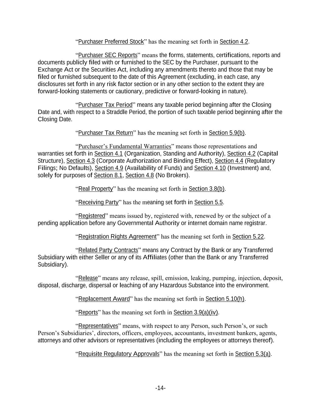 -14- “Purchaser Preferred Stock” has the meaning set forth in Section 4.2. “Purchaser SEC Reports” means the forms, statements, certifications, reports and documents publicly filed with or furnished to the SEC by the Purchaser, pursuant to the Exchange Act or the Securities Act, including any amendments thereto and those that may be filed or furnished subsequent to the date of this Agreement (excluding, in each case, any disclosures set forth in any risk factor section or in any other section to the extent they are forward-looking statements or cautionary, predictive or forward-looking in nature). “Purchaser Tax Period” means any taxable period beginning after the Closing Date and, with respect to a Straddle Period, the portion of such taxable period beginning after the Closing Date. “Purchaser Tax Return” has the meaning set forth in Section 5.9(b). “Purchaser’s Fundamental Warranties” means those representations and warranties set forth in Section 4.1 (Organization, Standing and Authority), Section 4.2 (Capital Structure), Section 4.3 (Corporate Authorization and Binding Effect), Section 4.4 (Regulatory Filings; No Defaults), Section 4.9 (Availability of Funds) and Section 4.10 (Investment) and, solely for purposes of Section 8.1, Section 4.8 (No Brokers). “Real Property” has the meaning set forth in Section 3.8(b). “Receiving Party” has the meaning set forth in Section 5.5. “Registered” means issued by, registered with, renewed by or the subject of a pending application before any Governmental Authority or internet domain name registrar. “Registration Rights Agreement” has the meaning set forth in Section 5.22. “Related Party Contracts” means any Contract by the Bank or any Transferred Subsidiary with either Seller or any of its Affiliates (other than the Bank or any Transferred Subsidiary). “Release” means any release, spill, emission, leaking, pumping, injection, deposit, disposal, discharge, dispersal or leaching of any Hazardous Substance into the environment. “Replacement Award” has the meaning set forth in Section 5.10(h). “Reports” has the meaning set forth in Section 3.9(a)(iv). “Representatives” means, with respect to any Person, such Person’s, or such Person’s Subsidiaries’, directors, officers, employees, accountants, investment bankers, agents, attorneys and other advisors or representatives (including the employees or attorneys thereof). “Requisite Regulatory Approvals” has the meaning set forth in Section 5.3(a).