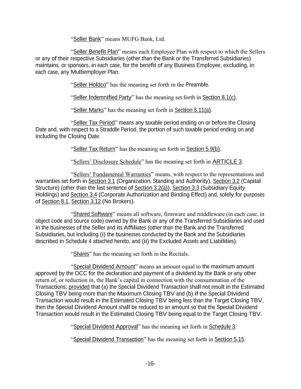 -16- “Seller Bank” means MUFG Bank, Ltd. “Seller Benefit Plan” means each Employee Plan with respect to which the Sellers or any of their respective Subsidiaries (other than the Bank or the Transferred Subsidiaries) maintains, or sponsors, in each case, for the benefit of any Business Employee, excluding, in each case, any Multiemployer Plan. “Seller Holdco” has the meaning set forth in the Preamble. “Seller Indemnified Party” has the meaning set forth in Section 8.1(c). “Seller Marks” has the meaning set forth in Section 5.11(a). “Seller Tax Period” means any taxable period ending on or before the Closing Date and, with respect to a Straddle Period, the portion of such taxable period ending on and including the Closing Date. “Seller Tax Return” has the meaning set forth in Section 5.9(b). “Sellers’ Disclosure Schedule” has the meaning set forth in ARTICLE 3. “Sellers’ Fundamental Warranties” means, with respect to the representations and warranties set forth in Section 3.1 (Organization, Standing and Authority), Section 3.2 (Capital Structure) (other than the last sentence of Section 3.2(a)), Section 3.3 (Subsidiary Equity Holdings) and Section 3.4 (Corporate Authorization and Binding Effect) and, solely for purposes of Section 8.1, Section 3.12 (No Brokers). “Shared Software” means all software, firmware and middleware (in each case, in object code and source code) owned by the Bank or any of the Transferred Subsidiaries and used in the businesses of the Seller and its Affiliates (other than the Bank and the Transferred Subsidiaries, but including (i) the businesses conducted by the Bank and the Subsidiaries described in Schedule 4 attached hereto, and (ii) the Excluded Assets and Liabilities). “Shares” has the meaning set forth in the Recitals. “Special Dividend Amount” means an amount equal to the maximum amount approved by the OCC for the declaration and payment of a dividend by the Bank or any other return of, or reduction in, the Bank’s capital in connection with the consummation of the Transactions; provided that (a) the Special Dividend Transaction shall not result in the Estimated Closing TBV being more than the Maximum Closing TBV and (b) if the Special Dividend Transaction would result in the Estimated Closing TBV being less than the Target Closing TBV, then the Special Dividend Amount shall be reduced to an amount so that the Special Dividend Transaction would result in the Estimated Closing TBV being equal to the Target Closing TBV. “Special Dividend Approval” has the meaning set forth in Schedule 3. “Special Dividend Transaction” has the meaning set forth in Section 5.15.