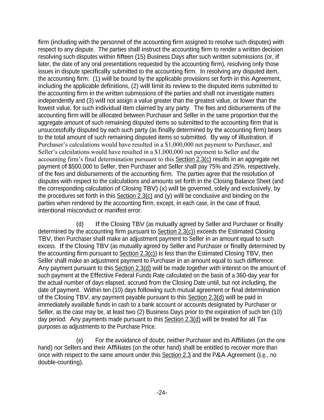 -24- firm (including with the personnel of the accounting firm assigned to resolve such disputes) with respect to any dispute. The parties shall instruct the accounting firm to render a written decision resolving such disputes within fifteen (15) Business Days after such written submissions (or, if later, the date of any oral presentations requested by the accounting firm), resolving only those issues in dispute specifically submitted to the accounting firm. In resolving any disputed item, the accounting firm: (1) will be bound by the applicable provisions set forth in this Agreement, including the applicable definitions, (2) will limit its review to the disputed items submitted to the accounting firm in the written submissions of the parties and shall not investigate matters independently and (3) will not assign a value greater than the greatest value, or lower than the lowest value, for such individual item claimed by any party. The fees and disbursements of the accounting firm will be allocated between Purchaser and Seller in the same proportion that the aggregate amount of such remaining disputed items so submitted to the accounting firm that is unsuccessfully disputed by each such party (as finally determined by the accounting firm) bears to the total amount of such remaining disputed items so submitted. By way of illustration, if Purchaser’s calculations would have resulted in a $1,000,000 net payment to Purchaser, and Seller’s calculations would have resulted in a $1,000,000 net payment to Seller and the accounting firm’s final determination pursuant to this Section 2.3(c) results in an aggregate net payment of $500,000 to Seller, then Purchaser and Seller shall pay 75% and 25%, respectively, of the fees and disbursements of the accounting firm. The parties agree that the resolution of disputes with respect to the calculations and amounts set forth in the Closing Balance Sheet (and the corresponding calculation of Closing TBV) (x) will be governed, solely and exclusively, by the procedures set forth in this Section 2.3(c) and (y) will be conclusive and binding on the parties when rendered by the accounting firm, except, in each case, in the case of fraud, intentional misconduct or manifest error. (d) If the Closing TBV (as mutually agreed by Seller and Purchaser or finally determined by the accounting firm pursuant to Section 2.3(c)) exceeds the Estimated Closing TBV, then Purchaser shall make an adjustment payment to Seller in an amount equal to such excess. If the Closing TBV (as mutually agreed by Seller and Purchaser or finally determined by the accounting firm pursuant to Section 2.3(c)) is less than the Estimated Closing TBV, then Seller shall make an adjustment payment to Purchaser in an amount equal to such difference. Any payment pursuant to this Section 2.3(d) will be made together with interest on the amount of such payment at the Effective Federal Funds Rate calculated on the basis of a 360-day year for the actual number of days elapsed, accrued from the Closing Date until, but not including, the date of payment. Within ten (10) days following such mutual agreement or final determination of the Closing TBV, any payment payable pursuant to this Section 2.3(d) will be paid in immediately available funds in cash to a bank account or accounts designated by Purchaser or Seller, as the case may be, at least two (2) Business Days prior to the expiration of such ten (10) day period. Any payments made pursuant to this Section 2.3(d) will be treated for all Tax purposes as adjustments to the Purchase Price. (e) For the avoidance of doubt, neither Purchaser and its Affiliates (on the one hand) nor Sellers and their Affiliates (on the other hand) shall be entitled to recover more than once with respect to the same amount under this Section 2.3 and the P&A Agreement (i.e., no double-counting).