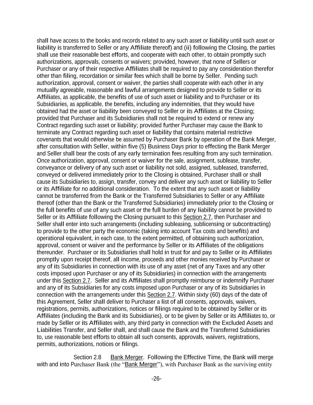 -26- shall have access to the books and records related to any such asset or liability until such asset or liability is transferred to Seller or any Affiliate thereof) and (ii) following the Closing, the parties shall use their reasonable best efforts, and cooperate with each other, to obtain promptly such authorizations, approvals, consents or waivers; provided, however, that none of Sellers or Purchaser or any of their respective Affiliates shall be required to pay any consideration therefor other than filing, recordation or similar fees which shall be borne by Seller. Pending such authorization, approval, consent or waiver, the parties shall cooperate with each other in any mutually agreeable, reasonable and lawful arrangements designed to provide to Seller or its Affiliates, as applicable, the benefits of use of such asset or liability and to Purchaser or its Subsidiaries, as applicable, the benefits, including any indemnities, that they would have obtained had the asset or liability been conveyed to Seller or its Affiliates at the Closing; provided that Purchaser and its Subsidiaries shall not be required to extend or renew any Contract regarding such asset or liability; provided further Purchaser may cause the Bank to terminate any Contract regarding such asset or liability that contains material restrictive covenants that would otherwise be assumed by Purchaser Bank by operation of the Bank Merger, after consultation with Seller, within five (5) Business Days prior to effecting the Bank Merger and Seller shall bear the costs of any early termination fees resulting from any such termination. Once authorization, approval, consent or waiver for the sale, assignment, sublease, transfer, conveyance or delivery of any such asset or liability not sold, assigned, subleased, transferred, conveyed or delivered immediately prior to the Closing is obtained, Purchaser shall or shall cause its Subsidiaries to, assign, transfer, convey and deliver any such asset or liability to Seller or its Affiliate for no additional consideration. To the extent that any such asset or liability cannot be transferred from the Bank or the Transferred Subsidiaries to Seller or any Affiliate thereof (other than the Bank or the Transferred Subsidiaries) immediately prior to the Closing or the full benefits of use of any such asset or the full burden of any liability cannot be provided to Seller or its Affiliate following the Closing pursuant to this Section 2.7, then Purchaser and Seller shall enter into such arrangements (including subleasing, sublicensing or subcontracting) to provide to the other party the economic (taking into account Tax costs and benefits) and operational equivalent, in each case, to the extent permitted, of obtaining such authorization, approval, consent or waiver and the performance by Seller or its Affiliates of the obligations thereunder. Purchaser or its Subsidiaries shall hold in trust for and pay to Seller or its Affiliates promptly upon receipt thereof, all income, proceeds and other monies received by Purchaser or any of its Subsidiaries in connection with its use of any asset (net of any Taxes and any other costs imposed upon Purchaser or any of its Subsidiaries) in connection with the arrangements under this Section 2.7. Seller and its Affiliates shall promptly reimburse or indemnify Purchaser and any of its Subsidiaries for any costs imposed upon Purchaser or any of its Subsidiaries in connection with the arrangements under this Section 2.7. Within sixty (60) days of the date of this Agreement, Seller shall deliver to Purchaser a list of all consents, approvals, waivers, registrations, permits, authorizations, notices or filings required to be obtained by Seller or its Affiliates (including the Bank and its Subsidiaries), or to be given by Seller or its Affiliates to, or made by Seller or its Affiliates with, any third party in connection with the Excluded Assets and Liabilities Transfer, and Seller shall, and shall cause the Bank and the Transferred Subsidiaries to, use reasonable best efforts to obtain all such consents, approvals, waivers, registrations, permits, authorizations, notices or filings. Section 2.8 Bank Merger. Following the Effective Time, the Bank will merge with and into Purchaser Bank (the “Bank Merger”), with Purchaser Bank as the surviving entity
