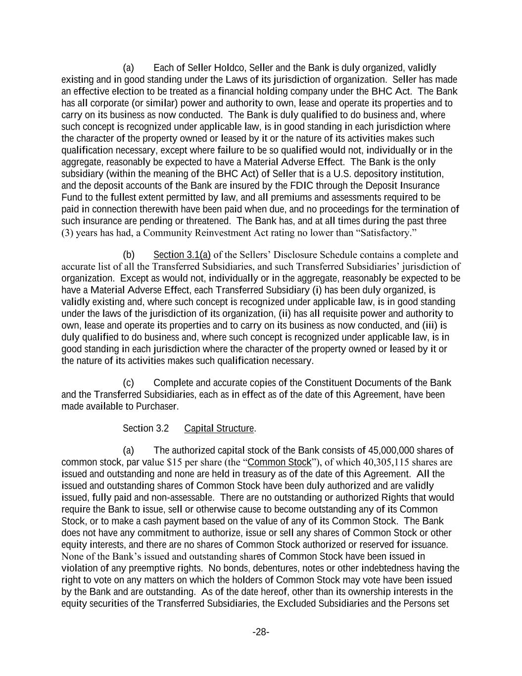 -28- (a) Each of Seller Holdco, Seller and the Bank is duly organized, validly existing and in good standing under the Laws of its jurisdiction of organization. Seller has made an effective election to be treated as a financial holding company under the BHC Act. The Bank has all corporate (or similar) power and authority to own, lease and operate its properties and to carry on its business as now conducted. The Bank is duly qualified to do business and, where such concept is recognized under applicable law, is in good standing in each jurisdiction where the character of the property owned or leased by it or the nature of its activities makes such qualification necessary, except where failure to be so qualified would not, individually or in the aggregate, reasonably be expected to have a Material Adverse Effect. The Bank is the only subsidiary (within the meaning of the BHC Act) of Seller that is a U.S. depository institution, and the deposit accounts of the Bank are insured by the FDIC through the Deposit Insurance Fund to the fullest extent permitted by law, and all premiums and assessments required to be paid in connection therewith have been paid when due, and no proceedings for the termination of such insurance are pending or threatened. The Bank has, and at all times during the past three (3) years has had, a Community Reinvestment Act rating no lower than “Satisfactory.” (b) Section 3.1(a) of the Sellers’ Disclosure Schedule contains a complete and accurate list of all the Transferred Subsidiaries, and such Transferred Subsidiaries’ jurisdiction of organization. Except as would not, individually or in the aggregate, reasonably be expected to be have a Material Adverse Effect, each Transferred Subsidiary (i) has been duly organized, is validly existing and, where such concept is recognized under applicable law, is in good standing under the laws of the jurisdiction of its organization, (ii) has all requisite power and authority to own, lease and operate its properties and to carry on its business as now conducted, and (iii) is duly qualified to do business and, where such concept is recognized under applicable law, is in good standing in each jurisdiction where the character of the property owned or leased by it or the nature of its activities makes such qualification necessary. (c) Complete and accurate copies of the Constituent Documents of the Bank and the Transferred Subsidiaries, each as in effect as of the date of this Agreement, have been made available to Purchaser. Section 3.2 Capital Structure. (a) The authorized capital stock of the Bank consists of 45,000,000 shares of common stock, par value $15 per share (the “Common Stock”), of which 40,305,115 shares are issued and outstanding and none are held in treasury as of the date of this Agreement. All the issued and outstanding shares of Common Stock have been duly authorized and are validly issued, fully paid and non-assessable. There are no outstanding or authorized Rights that would require the Bank to issue, sell or otherwise cause to become outstanding any of its Common Stock, or to make a cash payment based on the value of any of its Common Stock. The Bank does not have any commitment to authorize, issue or sell any shares of Common Stock or other equity interests, and there are no shares of Common Stock authorized or reserved for issuance. None of the Bank’s issued and outstanding shares of Common Stock have been issued in violation of any preemptive rights. No bonds, debentures, notes or other indebtedness having the right to vote on any matters on which the holders of Common Stock may vote have been issued by the Bank and are outstanding. As of the date hereof, other than its ownership interests in the equity securities of the Transferred Subsidiaries, the Excluded Subsidiaries and the Persons set