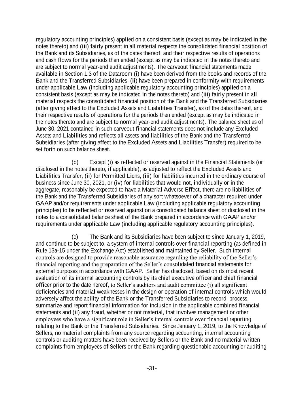 -31- regulatory accounting principles) applied on a consistent basis (except as may be indicated in the notes thereto) and (iii) fairly present in all material respects the consolidated financial position of the Bank and its Subsidiaries, as of the dates thereof, and their respective results of operations and cash flows for the periods then ended (except as may be indicated in the notes thereto and are subject to normal year-end audit adjustments). The carveout financial statements made available in Section 1.3 of the Dataroom (i) have been derived from the books and records of the Bank and the Transferred Subsidiaries, (ii) have been prepared in conformity with requirements under applicable Law (including applicable regulatory accounting principles) applied on a consistent basis (except as may be indicated in the notes thereto) and (iii) fairly present in all material respects the consolidated financial position of the Bank and the Transferred Subsidiaries (after giving effect to the Excluded Assets and Liabilities Transfer), as of the dates thereof, and their respective results of operations for the periods then ended (except as may be indicated in the notes thereto and are subject to normal year-end audit adjustments). The balance sheet as of June 30, 2021 contained in such carveout financial statements does not include any Excluded Assets and Liabilities and reflects all assets and liabilities of the Bank and the Transferred Subsidiaries (after giving effect to the Excluded Assets and Liabilities Transfer) required to be set forth on such balance sheet. (b) Except (i) as reflected or reserved against in the Financial Statements (or disclosed in the notes thereto, if applicable), as adjusted to reflect the Excluded Assets and Liabilities Transfer, (ii) for Permitted Liens, (iii) for liabilities incurred in the ordinary course of business since June 30, 2021, or (iv) for liabilities that would not, individually or in the aggregate, reasonably be expected to have a Material Adverse Effect, there are no liabilities of the Bank and the Transferred Subsidiaries of any sort whatsoever of a character required under GAAP and/or requirements under applicable Law (including applicable regulatory accounting principles) to be reflected or reserved against on a consolidated balance sheet or disclosed in the notes to a consolidated balance sheet of the Bank prepared in accordance with GAAP and/or requirements under applicable Law (including applicable regulatory accounting principles). (c) The Bank and its Subsidiaries have been subject to since January 1, 2019, and continue to be subject to, a system of internal controls over financial reporting (as defined in Rule 13a-15 under the Exchange Act) established and maintained by Seller. Such internal controls are designed to provide reasonable assurance regarding the reliability of the Seller’s financial reporting and the preparation of the Seller’s consolidated financial statements for external purposes in accordance with GAAP. Seller has disclosed, based on its most recent evaluation of its internal accounting controls by its chief executive officer and chief financial officer prior to the date hereof, to Seller’s auditors and audit committee (i) all significant deficiencies and material weaknesses in the design or operation of internal controls which would adversely affect the ability of the Bank or the Transferred Subsidiaries to record, process, summarize and report financial information for inclusion in the applicable combined financial statements and (ii) any fraud, whether or not material, that involves management or other employees who have a significant role in Seller’s internal controls over financial reporting relating to the Bank or the Transferred Subsidiaries. Since January 1, 2019, to the Knowledge of Sellers, no material complaints from any source regarding accounting, internal accounting controls or auditing matters have been received by Sellers or the Bank and no material written complaints from employees of Sellers or the Bank regarding questionable accounting or auditing