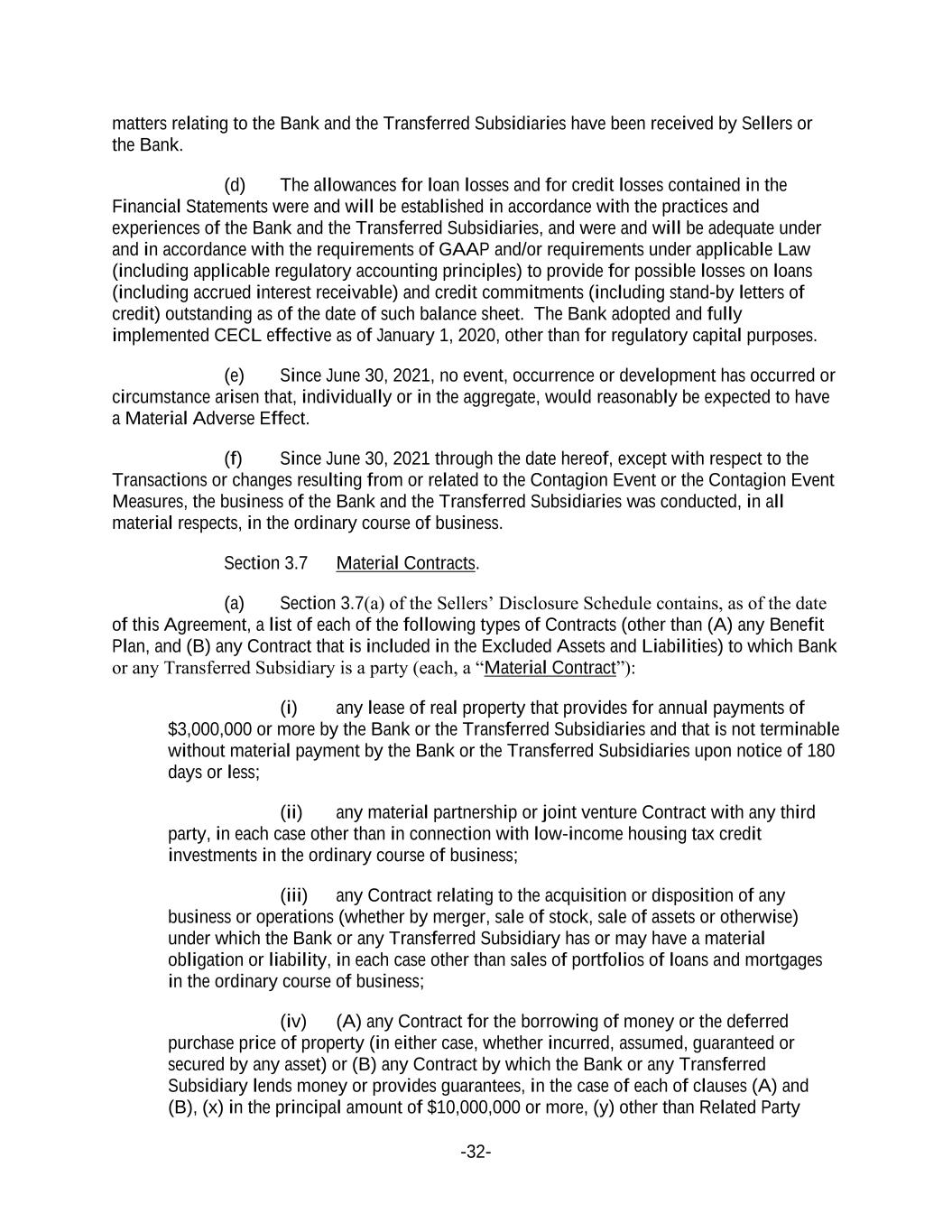 -32- matters relating to the Bank and the Transferred Subsidiaries have been received by Sellers or the Bank. (d) The allowances for loan losses and for credit losses contained in the Financial Statements were and will be established in accordance with the practices and experiences of the Bank and the Transferred Subsidiaries, and were and will be adequate under and in accordance with the requirements of GAAP and/or requirements under applicable Law (including applicable regulatory accounting principles) to provide for possible losses on loans (including accrued interest receivable) and credit commitments (including stand-by letters of credit) outstanding as of the date of such balance sheet. The Bank adopted and fully implemented CECL effective as of January 1, 2020, other than for regulatory capital purposes. (e) Since June 30, 2021, no event, occurrence or development has occurred or circumstance arisen that, individually or in the aggregate, would reasonably be expected to have a Material Adverse Effect. (f) Since June 30, 2021 through the date hereof, except with respect to the Transactions or changes resulting from or related to the Contagion Event or the Contagion Event Measures, the business of the Bank and the Transferred Subsidiaries was conducted, in all material respects, in the ordinary course of business. Section 3.7 Material Contracts. (a) Section 3.7(a) of the Sellers’ Disclosure Schedule contains, as of the date of this Agreement, a list of each of the following types of Contracts (other than (A) any Benefit Plan, and (B) any Contract that is included in the Excluded Assets and Liabilities) to which Bank or any Transferred Subsidiary is a party (each, a “Material Contract”): (i) any lease of real property that provides for annual payments of $3,000,000 or more by the Bank or the Transferred Subsidiaries and that is not terminable without material payment by the Bank or the Transferred Subsidiaries upon notice of 180 days or less; (ii) any material partnership or joint venture Contract with any third party, in each case other than in connection with low-income housing tax credit investments in the ordinary course of business; (iii) any Contract relating to the acquisition or disposition of any business or operations (whether by merger, sale of stock, sale of assets or otherwise) under which the Bank or any Transferred Subsidiary has or may have a material obligation or liability, in each case other than sales of portfolios of loans and mortgages in the ordinary course of business; (iv) (A) any Contract for the borrowing of money or the deferred purchase price of property (in either case, whether incurred, assumed, guaranteed or secured by any asset) or (B) any Contract by which the Bank or any Transferred Subsidiary lends money or provides guarantees, in the case of each of clauses (A) and (B), (x) in the principal amount of $10,000,000 or more, (y) other than Related Party