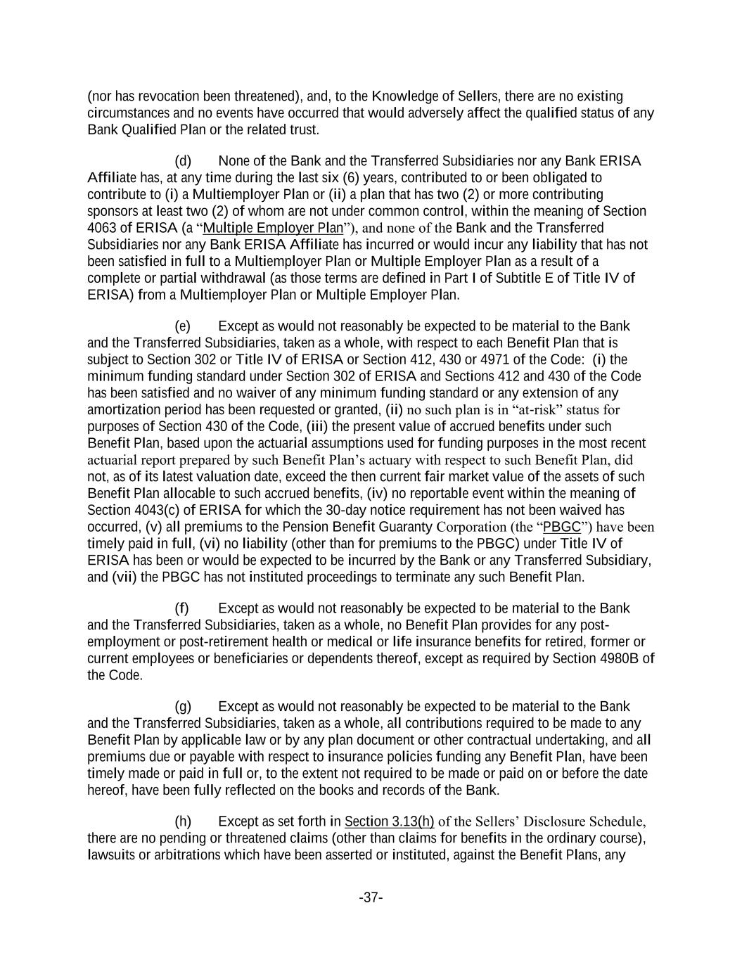 -37- (nor has revocation been threatened), and, to the Knowledge of Sellers, there are no existing circumstances and no events have occurred that would adversely affect the qualified status of any Bank Qualified Plan or the related trust. (d) None of the Bank and the Transferred Subsidiaries nor any Bank ERISA Affiliate has, at any time during the last six (6) years, contributed to or been obligated to contribute to (i) a Multiemployer Plan or (ii) a plan that has two (2) or more contributing sponsors at least two (2) of whom are not under common control, within the meaning of Section 4063 of ERISA (a “Multiple Employer Plan”), and none of the Bank and the Transferred Subsidiaries nor any Bank ERISA Affiliate has incurred or would incur any liability that has not been satisfied in full to a Multiemployer Plan or Multiple Employer Plan as a result of a complete or partial withdrawal (as those terms are defined in Part I of Subtitle E of Title IV of ERISA) from a Multiemployer Plan or Multiple Employer Plan. (e) Except as would not reasonably be expected to be material to the Bank and the Transferred Subsidiaries, taken as a whole, with respect to each Benefit Plan that is subject to Section 302 or Title IV of ERISA or Section 412, 430 or 4971 of the Code: (i) the minimum funding standard under Section 302 of ERISA and Sections 412 and 430 of the Code has been satisfied and no waiver of any minimum funding standard or any extension of any amortization period has been requested or granted, (ii) no such plan is in “at-risk” status for purposes of Section 430 of the Code, (iii) the present value of accrued benefits under such Benefit Plan, based upon the actuarial assumptions used for funding purposes in the most recent actuarial report prepared by such Benefit Plan’s actuary with respect to such Benefit Plan, did not, as of its latest valuation date, exceed the then current fair market value of the assets of such Benefit Plan allocable to such accrued benefits, (iv) no reportable event within the meaning of Section 4043(c) of ERISA for which the 30-day notice requirement has not been waived has occurred, (v) all premiums to the Pension Benefit Guaranty Corporation (the “PBGC”) have been timely paid in full, (vi) no liability (other than for premiums to the PBGC) under Title IV of ERISA has been or would be expected to be incurred by the Bank or any Transferred Subsidiary, and (vii) the PBGC has not instituted proceedings to terminate any such Benefit Plan. (f) Except as would not reasonably be expected to be material to the Bank and the Transferred Subsidiaries, taken as a whole, no Benefit Plan provides for any post- employment or post-retirement health or medical or life insurance benefits for retired, former or current employees or beneficiaries or dependents thereof, except as required by Section 4980B of the Code. (g) Except as would not reasonably be expected to be material to the Bank and the Transferred Subsidiaries, taken as a whole, all contributions required to be made to any Benefit Plan by applicable law or by any plan document or other contractual undertaking, and all premiums due or payable with respect to insurance policies funding any Benefit Plan, have been timely made or paid in full or, to the extent not required to be made or paid on or before the date hereof, have been fully reflected on the books and records of the Bank. (h) Except as set forth in Section 3.13(h) of the Sellers’ Disclosure Schedule, there are no pending or threatened claims (other than claims for benefits in the ordinary course), lawsuits or arbitrations which have been asserted or instituted, against the Benefit Plans, any