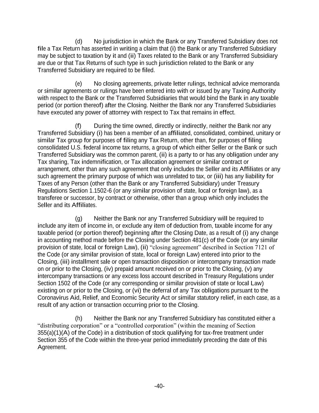 -40- (d) No jurisdiction in which the Bank or any Transferred Subsidiary does not file a Tax Return has asserted in writing a claim that (i) the Bank or any Transferred Subsidiary may be subject to taxation by it and (ii) Taxes related to the Bank or any Transferred Subsidiary are due or that Tax Returns of such type in such jurisdiction related to the Bank or any Transferred Subsidiary are required to be filed. (e) No closing agreements, private letter rulings, technical advice memoranda or similar agreements or rulings have been entered into with or issued by any Taxing Authority with respect to the Bank or the Transferred Subsidiaries that would bind the Bank in any taxable period (or portion thereof) after the Closing. Neither the Bank nor any Transferred Subsidiaries have executed any power of attorney with respect to Tax that remains in effect. (f) During the time owned, directly or indirectly, neither the Bank nor any Transferred Subsidiary (i) has been a member of an affiliated, consolidated, combined, unitary or similar Tax group for purposes of filing any Tax Return, other than, for purposes of filing consolidated U.S. federal income tax returns, a group of which either Seller or the Bank or such Transferred Subsidiary was the common parent, (ii) is a party to or has any obligation under any Tax sharing, Tax indemnification, or Tax allocation agreement or similar contract or arrangement, other than any such agreement that only includes the Seller and its Affiliates or any such agreement the primary purpose of which was unrelated to tax, or (iii) has any liability for Taxes of any Person (other than the Bank or any Transferred Subsidiary) under Treasury Regulations Section 1.1502-6 (or any similar provision of state, local or foreign law), as a transferee or successor, by contract or otherwise, other than a group which only includes the Seller and its Affiliates. (g) Neither the Bank nor any Transferred Subsidiary will be required to include any item of income in, or exclude any item of deduction from, taxable income for any taxable period (or portion thereof) beginning after the Closing Date, as a result of (i) any change in accounting method made before the Closing under Section 481(c) of the Code (or any similar provision of state, local or foreign Law), (ii) “closing agreement” described in Section 7121 of the Code (or any similar provision of state, local or foreign Law) entered into prior to the Closing, (iii) installment sale or open transaction disposition or intercompany transaction made on or prior to the Closing, (iv) prepaid amount received on or prior to the Closing, (v) any intercompany transactions or any excess loss account described in Treasury Regulations under Section 1502 of the Code (or any corresponding or similar provision of state or local Law) existing on or prior to the Closing, or (vi) the deferral of any Tax obligations pursuant to the Coronavirus Aid, Relief, and Economic Security Act or similar statutory relief, in each case, as a result of any action or transaction occurring prior to the Closing. (h) Neither the Bank nor any Transferred Subsidiary has constituted either a “distributing corporation” or a “controlled corporation” (within the meaning of Section 355(a)(1)(A) of the Code) in a distribution of stock qualifying for tax-free treatment under Section 355 of the Code within the three-year period immediately preceding the date of this Agreement.