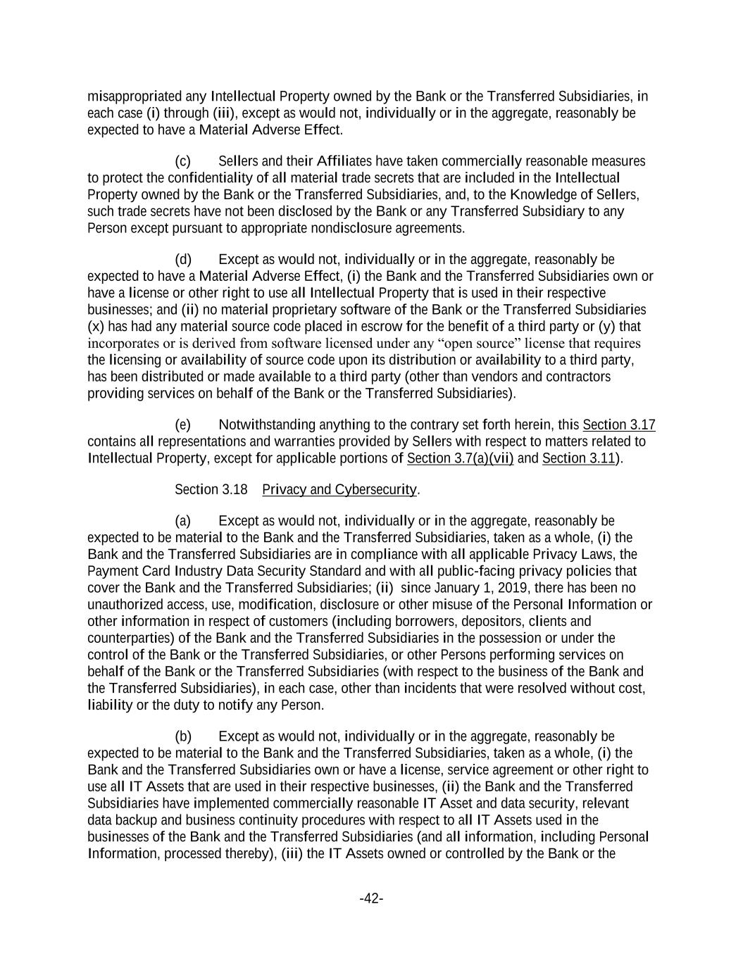 -42- misappropriated any Intellectual Property owned by the Bank or the Transferred Subsidiaries, in each case (i) through (iii), except as would not, individually or in the aggregate, reasonably be expected to have a Material Adverse Effect. (c) Sellers and their Affiliates have taken commercially reasonable measures to protect the confidentiality of all material trade secrets that are included in the Intellectual Property owned by the Bank or the Transferred Subsidiaries, and, to the Knowledge of Sellers, such trade secrets have not been disclosed by the Bank or any Transferred Subsidiary to any Person except pursuant to appropriate nondisclosure agreements. (d) Except as would not, individually or in the aggregate, reasonably be expected to have a Material Adverse Effect, (i) the Bank and the Transferred Subsidiaries own or have a license or other right to use all Intellectual Property that is used in their respective businesses; and (ii) no material proprietary software of the Bank or the Transferred Subsidiaries (x) has had any material source code placed in escrow for the benefit of a third party or (y) that incorporates or is derived from software licensed under any “open source” license that requires the licensing or availability of source code upon its distribution or availability to a third party, has been distributed or made available to a third party (other than vendors and contractors providing services on behalf of the Bank or the Transferred Subsidiaries). (e) Notwithstanding anything to the contrary set forth herein, this Section 3.17 contains all representations and warranties provided by Sellers with respect to matters related to Intellectual Property, except for applicable portions of Section 3.7(a)(vii) and Section 3.11). Section 3.18 Privacy and Cybersecurity. (a) Except as would not, individually or in the aggregate, reasonably be expected to be material to the Bank and the Transferred Subsidiaries, taken as a whole, (i) the Bank and the Transferred Subsidiaries are in compliance with all applicable Privacy Laws, the Payment Card Industry Data Security Standard and with all public-facing privacy policies that cover the Bank and the Transferred Subsidiaries; (ii) since January 1, 2019, there has been no unauthorized access, use, modification, disclosure or other misuse of the Personal Information or other information in respect of customers (including borrowers, depositors, clients and counterparties) of the Bank and the Transferred Subsidiaries in the possession or under the control of the Bank or the Transferred Subsidiaries, or other Persons performing services on behalf of the Bank or the Transferred Subsidiaries (with respect to the business of the Bank and the Transferred Subsidiaries), in each case, other than incidents that were resolved without cost, liability or the duty to notify any Person. (b) Except as would not, individually or in the aggregate, reasonably be expected to be material to the Bank and the Transferred Subsidiaries, taken as a whole, (i) the Bank and the Transferred Subsidiaries own or have a license, service agreement or other right to use all IT Assets that are used in their respective businesses, (ii) the Bank and the Transferred Subsidiaries have implemented commercially reasonable IT Asset and data security, relevant data backup and business continuity procedures with respect to all IT Assets used in the businesses of the Bank and the Transferred Subsidiaries (and all information, including Personal Information, processed thereby), (iii) the IT Assets owned or controlled by the Bank or the