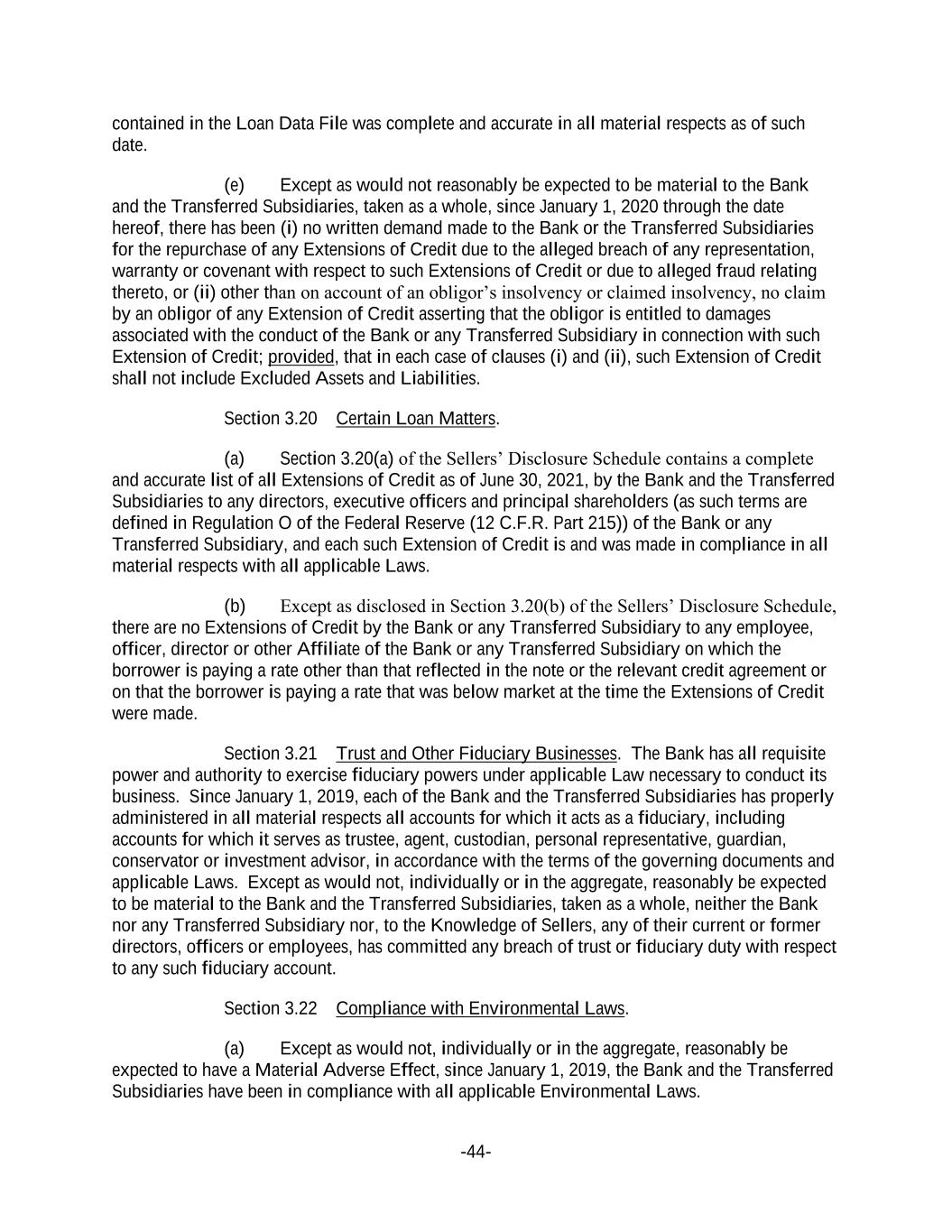 -44- contained in the Loan Data File was complete and accurate in all material respects as of such date. (e) Except as would not reasonably be expected to be material to the Bank and the Transferred Subsidiaries, taken as a whole, since January 1, 2020 through the date hereof, there has been (i) no written demand made to the Bank or the Transferred Subsidiaries for the repurchase of any Extensions of Credit due to the alleged breach of any representation, warranty or covenant with respect to such Extensions of Credit or due to alleged fraud relating thereto, or (ii) other than on account of an obligor’s insolvency or claimed insolvency, no claim by an obligor of any Extension of Credit asserting that the obligor is entitled to damages associated with the conduct of the Bank or any Transferred Subsidiary in connection with such Extension of Credit; provided, that in each case of clauses (i) and (ii), such Extension of Credit shall not include Excluded Assets and Liabilities. Section 3.20 Certain Loan Matters. (a) Section 3.20(a) of the Sellers’ Disclosure Schedule contains a complete and accurate list of all Extensions of Credit as of June 30, 2021, by the Bank and the Transferred Subsidiaries to any directors, executive officers and principal shareholders (as such terms are defined in Regulation O of the Federal Reserve (12 C.F.R. Part 215)) of the Bank or any Transferred Subsidiary, and each such Extension of Credit is and was made in compliance in all material respects with all applicable Laws. (b) Except as disclosed in Section 3.20(b) of the Sellers’ Disclosure Schedule, there are no Extensions of Credit by the Bank or any Transferred Subsidiary to any employee, officer, director or other Affiliate of the Bank or any Transferred Subsidiary on which the borrower is paying a rate other than that reflected in the note or the relevant credit agreement or on that the borrower is paying a rate that was below market at the time the Extensions of Credit were made. Section 3.21 Trust and Other Fiduciary Businesses. The Bank has all requisite power and authority to exercise fiduciary powers under applicable Law necessary to conduct its business. Since January 1, 2019, each of the Bank and the Transferred Subsidiaries has properly administered in all material respects all accounts for which it acts as a fiduciary, including accounts for which it serves as trustee, agent, custodian, personal representative, guardian, conservator or investment advisor, in accordance with the terms of the governing documents and applicable Laws. Except as would not, individually or in the aggregate, reasonably be expected to be material to the Bank and the Transferred Subsidiaries, taken as a whole, neither the Bank nor any Transferred Subsidiary nor, to the Knowledge of Sellers, any of their current or former directors, officers or employees, has committed any breach of trust or fiduciary duty with respect to any such fiduciary account. Section 3.22 Compliance with Environmental Laws. (a) Except as would not, individually or in the aggregate, reasonably be expected to have a Material Adverse Effect, since January 1, 2019, the Bank and the Transferred Subsidiaries have been in compliance with all applicable Environmental Laws.
