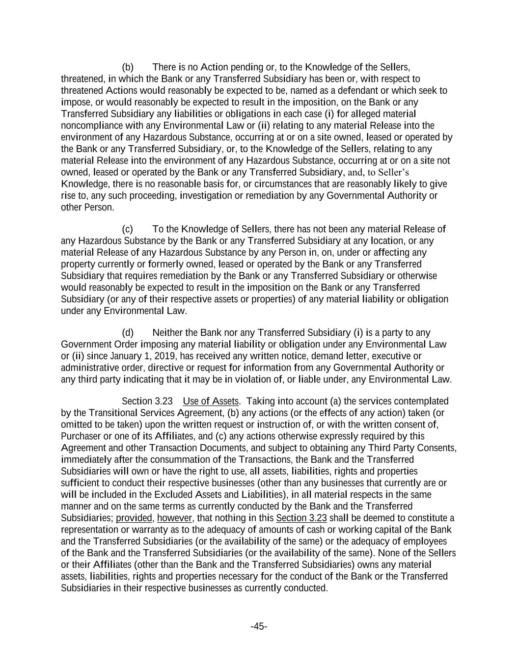 -45- (b) There is no Action pending or, to the Knowledge of the Sellers, threatened, in which the Bank or any Transferred Subsidiary has been or, with respect to threatened Actions would reasonably be expected to be, named as a defendant or which seek to impose, or would reasonably be expected to result in the imposition, on the Bank or any Transferred Subsidiary any liabilities or obligations in each case (i) for alleged material noncompliance with any Environmental Law or (ii) relating to any material Release into the environment of any Hazardous Substance, occurring at or on a site owned, leased or operated by the Bank or any Transferred Subsidiary, or, to the Knowledge of the Sellers, relating to any material Release into the environment of any Hazardous Substance, occurring at or on a site not owned, leased or operated by the Bank or any Transferred Subsidiary, and, to Seller’s Knowledge, there is no reasonable basis for, or circumstances that are reasonably likely to give rise to, any such proceeding, investigation or remediation by any Governmental Authority or other Person. (c) To the Knowledge of Sellers, there has not been any material Release of any Hazardous Substance by the Bank or any Transferred Subsidiary at any location, or any material Release of any Hazardous Substance by any Person in, on, under or affecting any property currently or formerly owned, leased or operated by the Bank or any Transferred Subsidiary that requires remediation by the Bank or any Transferred Subsidiary or otherwise would reasonably be expected to result in the imposition on the Bank or any Transferred Subsidiary (or any of their respective assets or properties) of any material liability or obligation under any Environmental Law. (d) Neither the Bank nor any Transferred Subsidiary (i) is a party to any Government Order imposing any material liability or obligation under any Environmental Law or (ii) since January 1, 2019, has received any written notice, demand letter, executive or administrative order, directive or request for information from any Governmental Authority or any third party indicating that it may be in violation of, or liable under, any Environmental Law. Section 3.23 Use of Assets. Taking into account (a) the services contemplated by the Transitional Services Agreement, (b) any actions (or the effects of any action) taken (or omitted to be taken) upon the written request or instruction of, or with the written consent of, Purchaser or one of its Affiliates, and (c) any actions otherwise expressly required by this Agreement and other Transaction Documents, and subject to obtaining any Third Party Consents, immediately after the consummation of the Transactions, the Bank and the Transferred Subsidiaries will own or have the right to use, all assets, liabilities, rights and properties sufficient to conduct their respective businesses (other than any businesses that currently are or will be included in the Excluded Assets and Liabilities), in all material respects in the same manner and on the same terms as currently conducted by the Bank and the Transferred Subsidiaries; provided, however, that nothing in this Section 3.23 shall be deemed to constitute a representation or warranty as to the adequacy of amounts of cash or working capital of the Bank and the Transferred Subsidiaries (or the availability of the same) or the adequacy of employees of the Bank and the Transferred Subsidiaries (or the availability of the same). None of the Sellers or their Affiliates (other than the Bank and the Transferred Subsidiaries) owns any material assets, liabilities, rights and properties necessary for the conduct of the Bank or the Transferred Subsidiaries in their respective businesses as currently conducted.